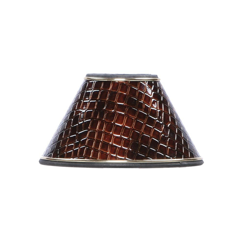Абажур с нижним способом крепления, имеет конструкцию, основой которой служит металлический каркас с применением технологии порошковой покраски и креплением под цоколь E14(миньон – Ø 2.8 см). В отделке используется Голландский пластик обтянутый тканью - искусственная кожа. Абажур декорируется золотым молдингом. Мощность ламп: 60W