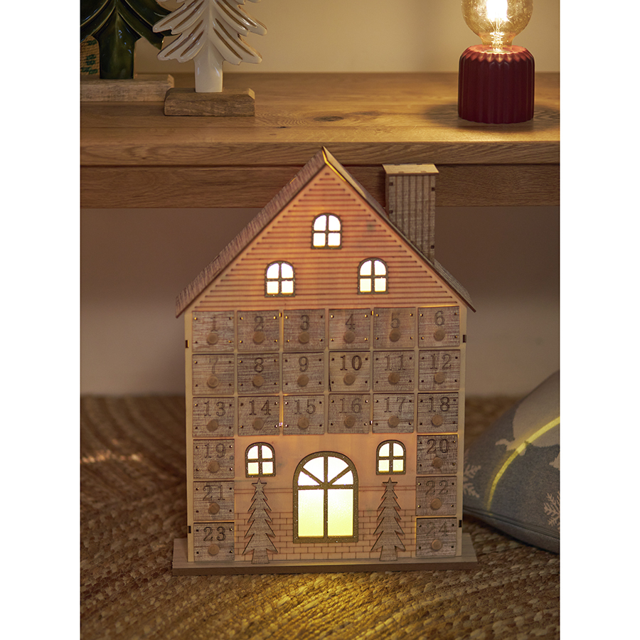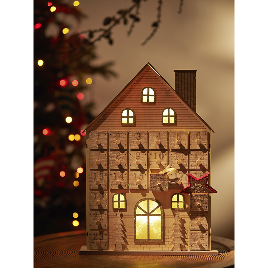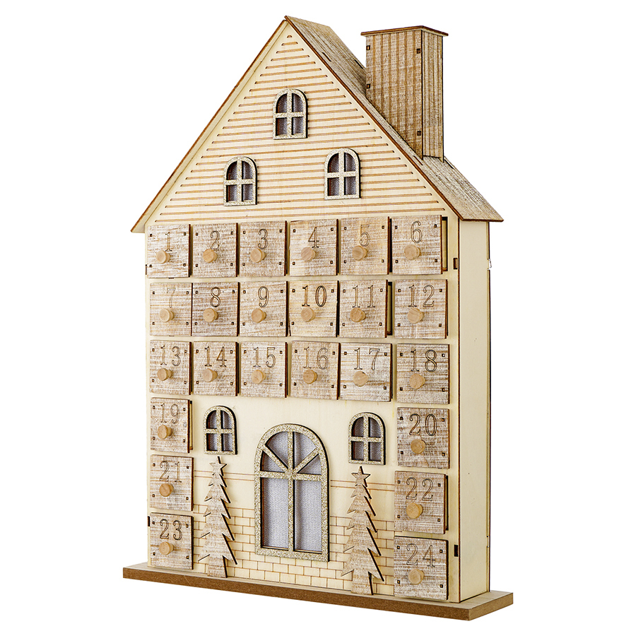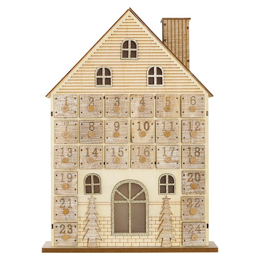 Этот простой, но в то же время очень важный элемент интерьера, сделает каждое утро в декабре особенным и незабываемым. Календарь изготовлен в форме домика с многочисленными окошками, в которых по вечерам зажигаются уютные огоньки. Его стены украшают крохотные ящики с секретами, за которыми спрятаны несметные сокровища. Вы можете размещать в них угощения, небольшие презенты и добрые пожелания. Трогательный дизайн пробуждает в душе приятные воспоминания о беззаботном детстве, когда мечты казались реальными, а вера в магию Новогодней ночи была непоколебима. Изделие выполнено из фанеры, что обеспечивает ему прочность и долговечность. Для работы требуются 2 батарейки типа АА, которые не входят в комплект.
