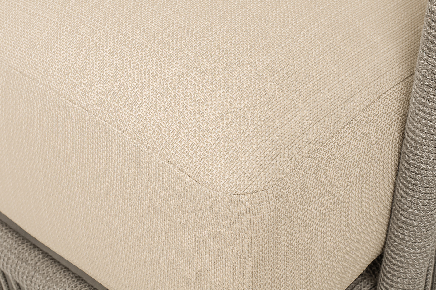 Диван имеет алюминиевый каркас, окрашенный порошковой краской в светло-серый (RAL7035) цвет. Боковины каркаса и спинка вручную оплетены роупом - эластичными синтетическими лентами, изготовленными из высокопрочных полиэфирных волокон. Цвет оплетки - серый меланж.