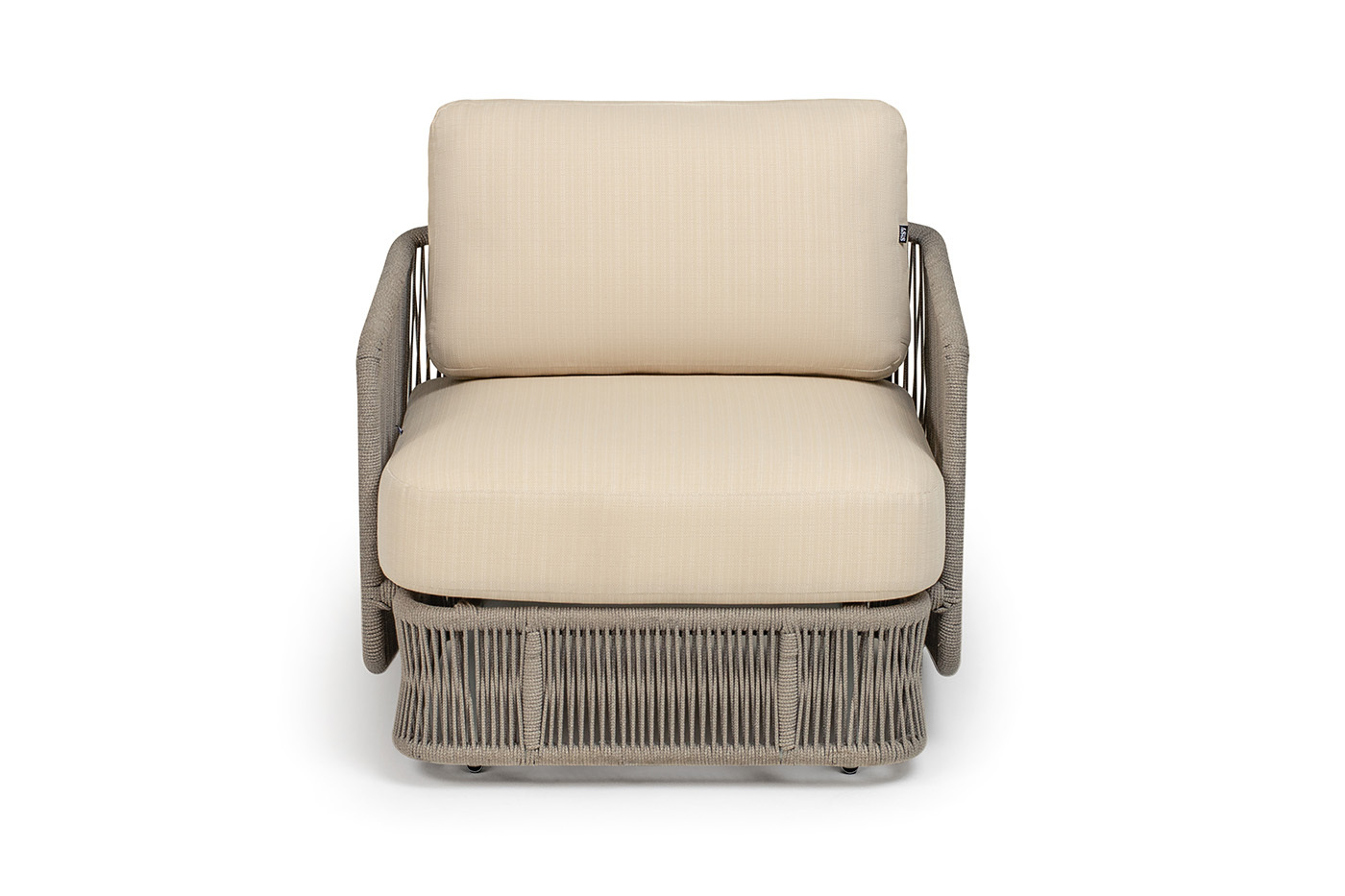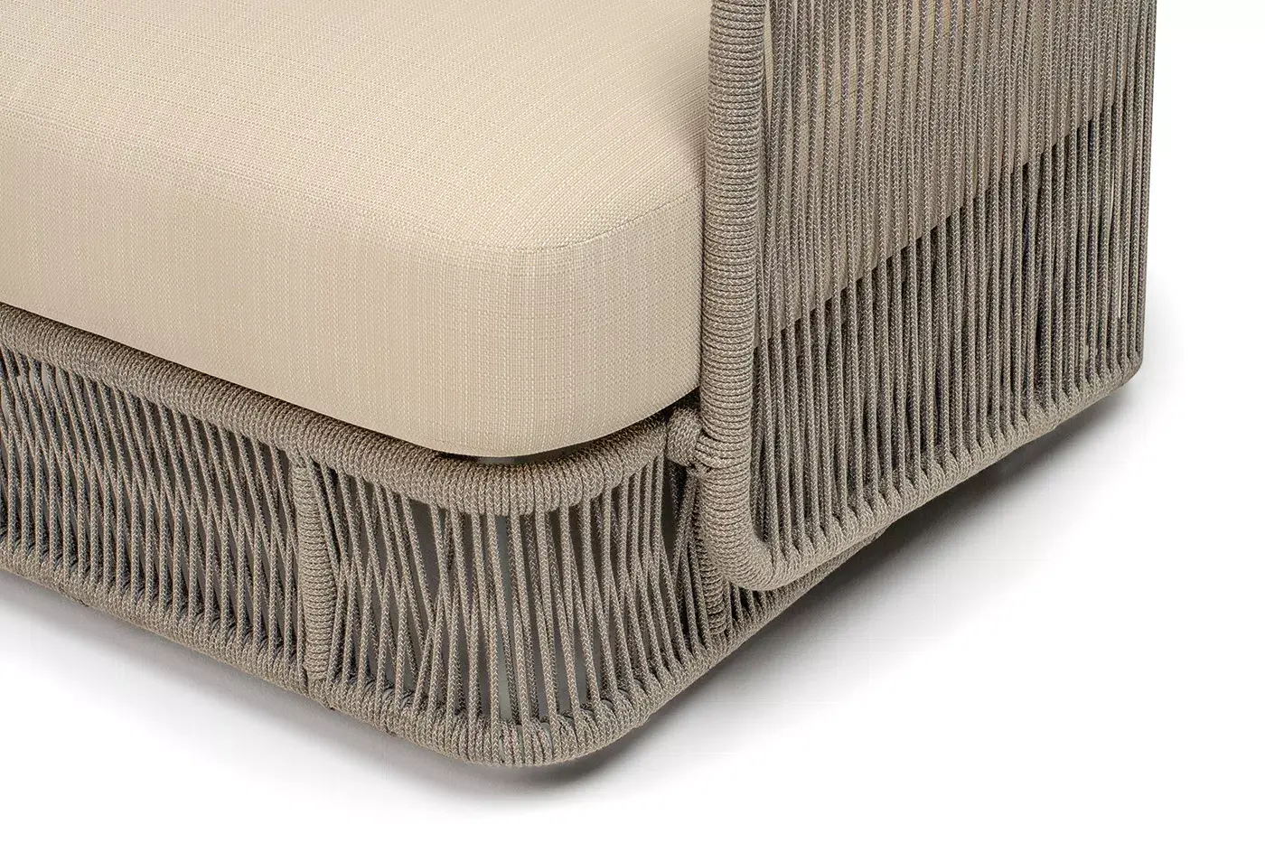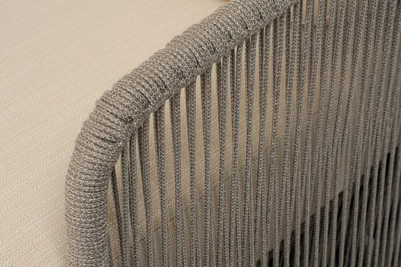 Каркас кресла изготовлен из прочного алюминиевого сплава и окрашен в светло-серый (RAL7035) цвет, который предотвращает возникновение коррозии и обеспечивает долгий срок службы. На боковинах кресла выполнена оплетка из роупа цвета серый меланж. Такое плетение обладает высокой стойкостью к износу и долговечностью, сохраняя свои свойства даже при активном использовании.