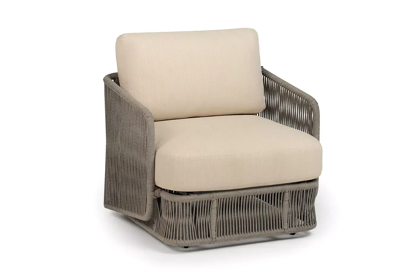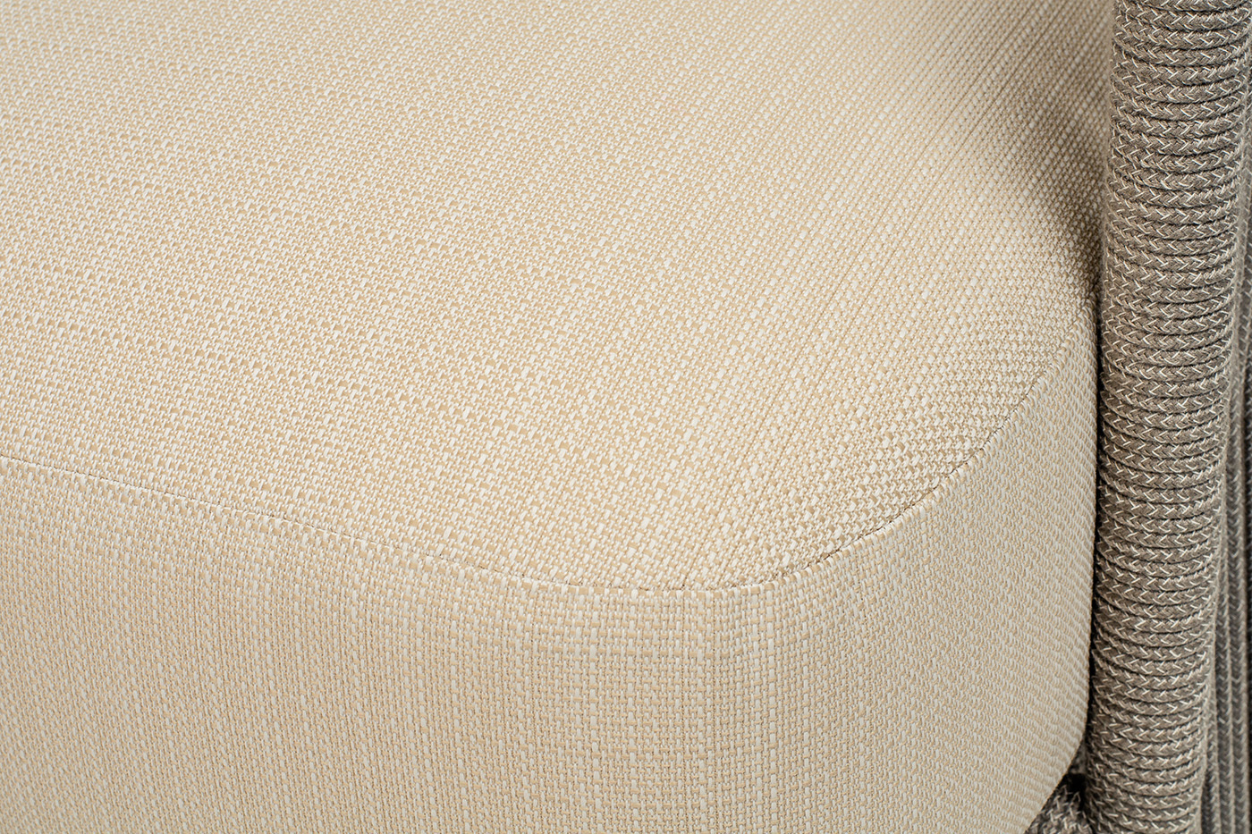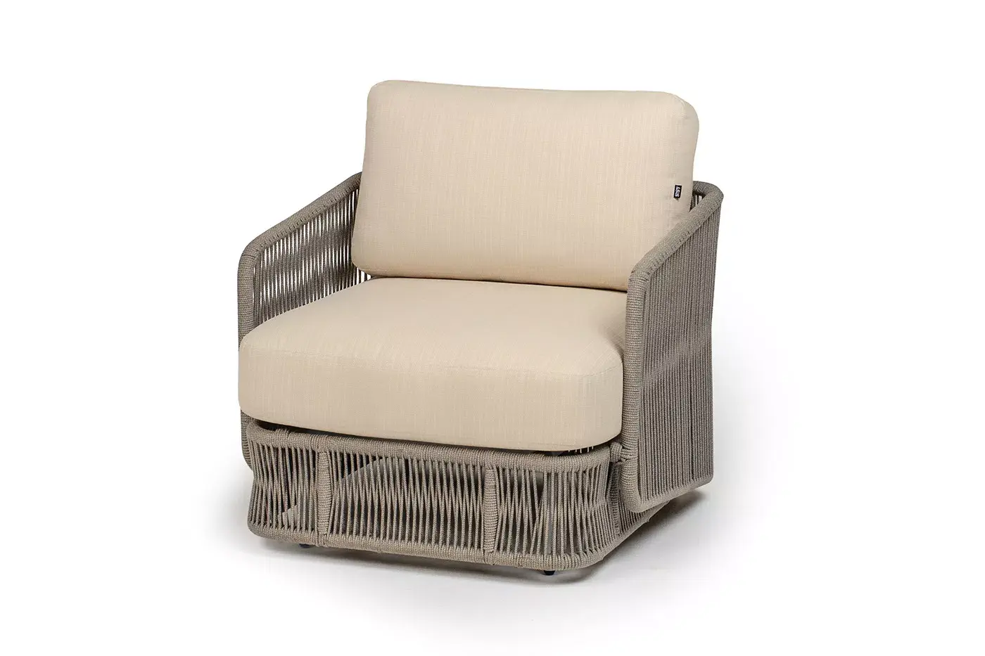 Каркас кресла изготовлен из прочного алюминиевого сплава и окрашен в светло-серый (RAL7035) цвет, который предотвращает возникновение коррозии и обеспечивает долгий срок службы. На боковинах кресла выполнена оплетка из роупа цвета серый меланж. Такое плетение обладает высокой стойкостью к износу и долговечностью, сохраняя свои свойства даже при активном использовании.