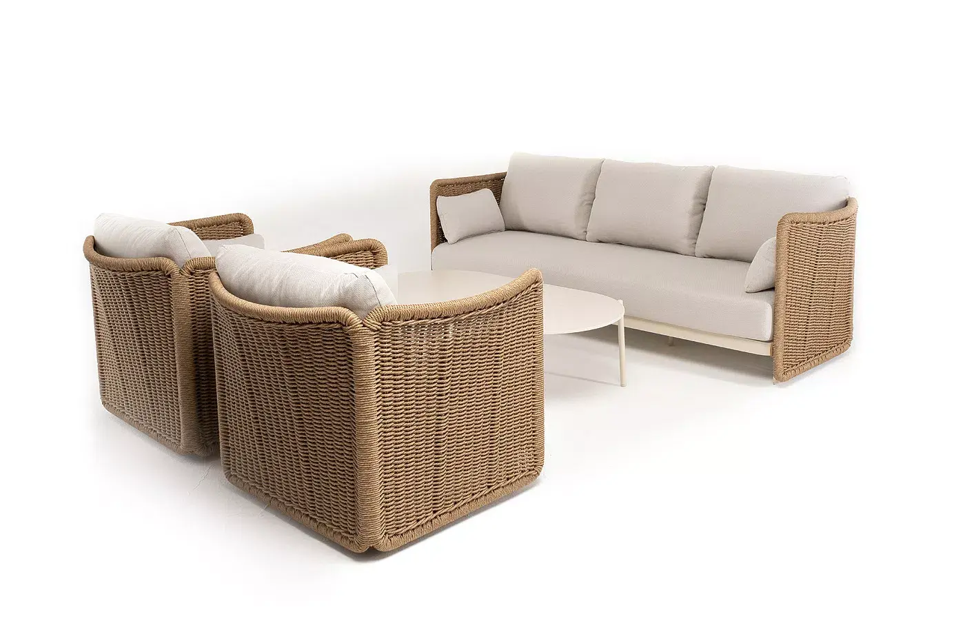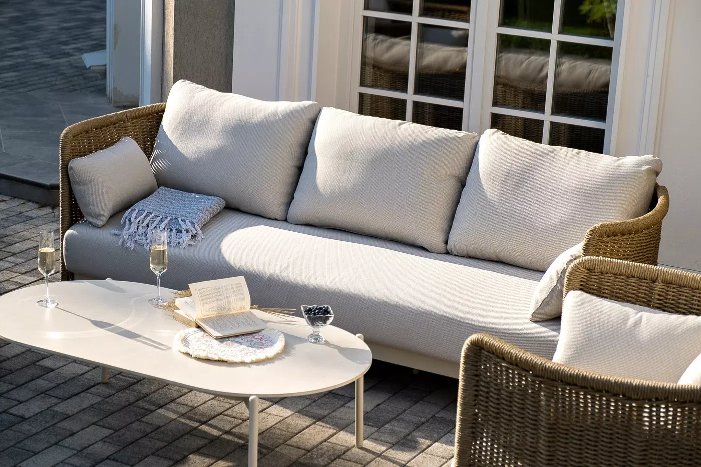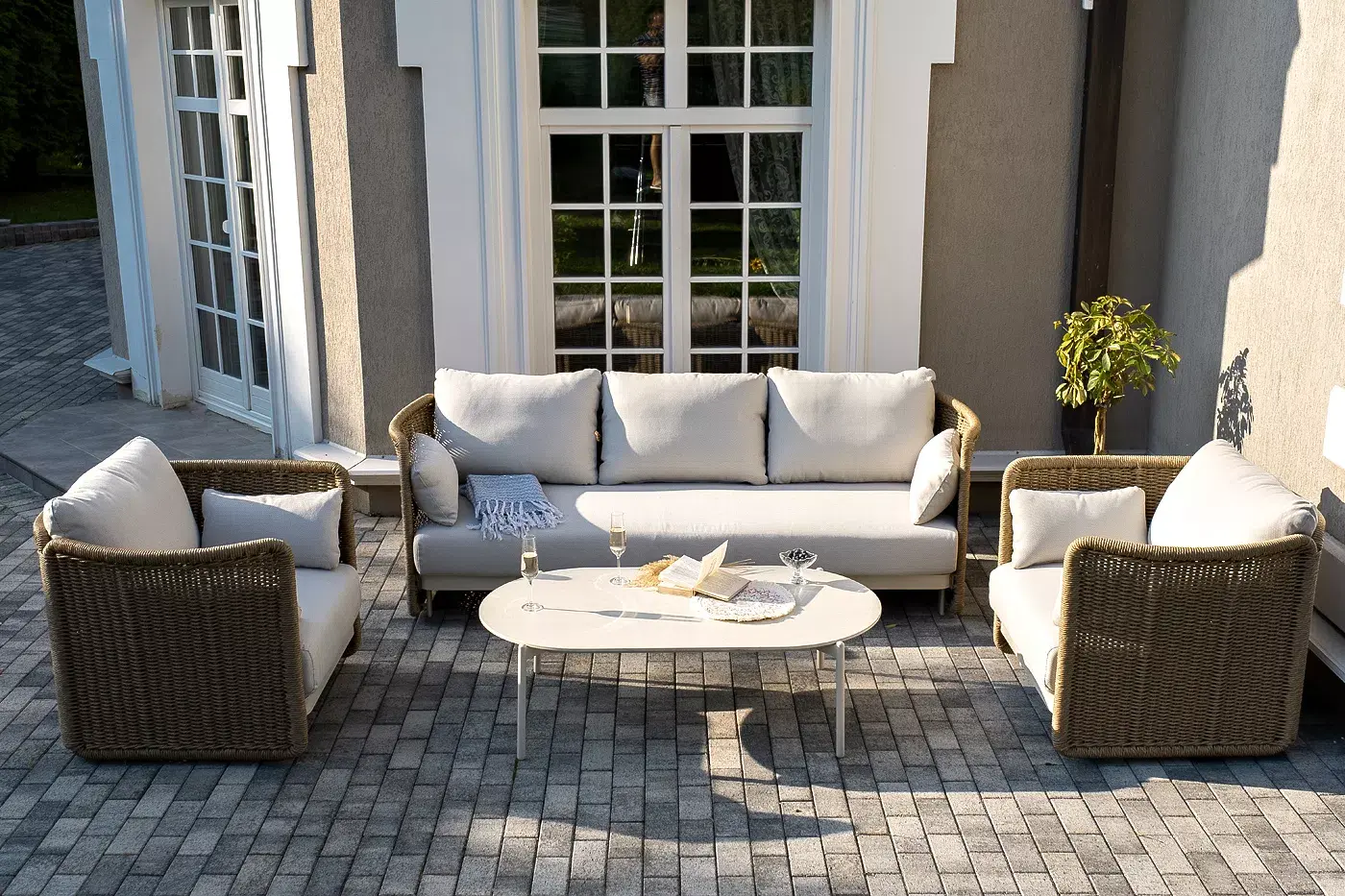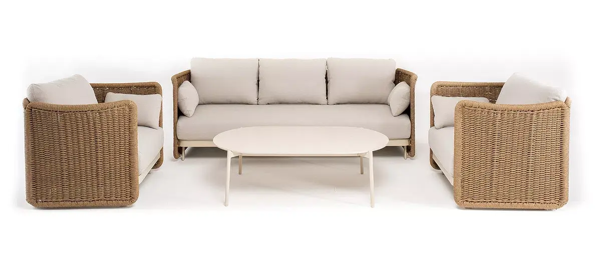 Журнальный столик выполнен из алюминия, окрашенного износостойкой краской, а его оплетка выполнена из круглого искусственного ротанга ручного плетения - 7 мм соломенного цвета. Столешница - овальная, выполнена из искусственного камня белового цвета.
