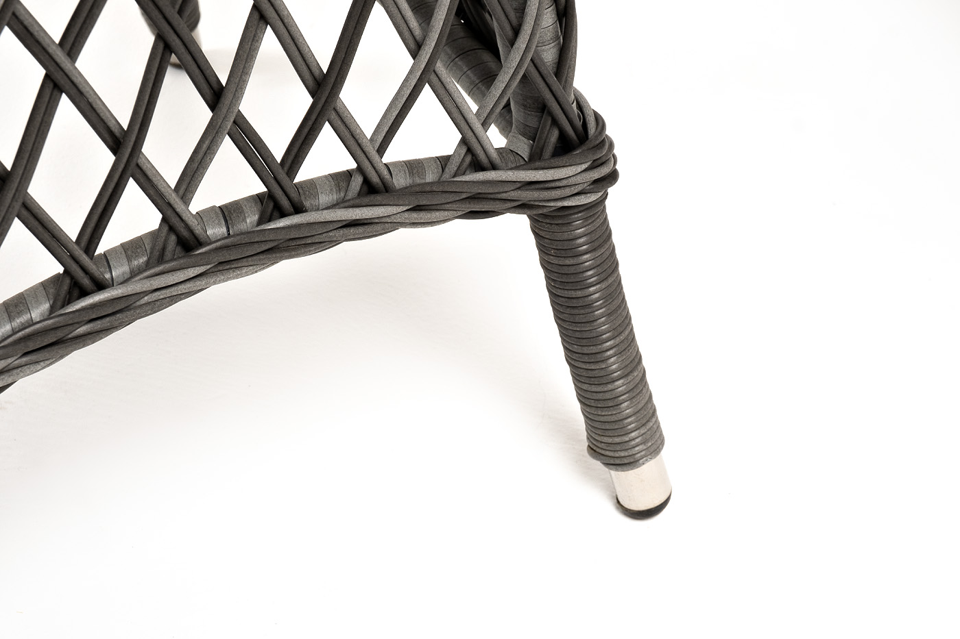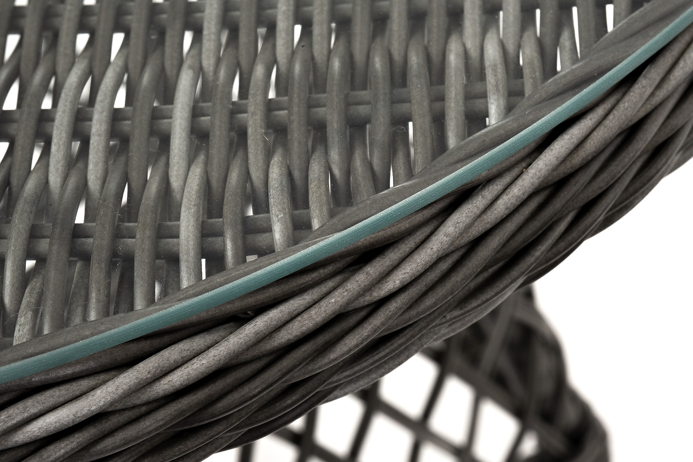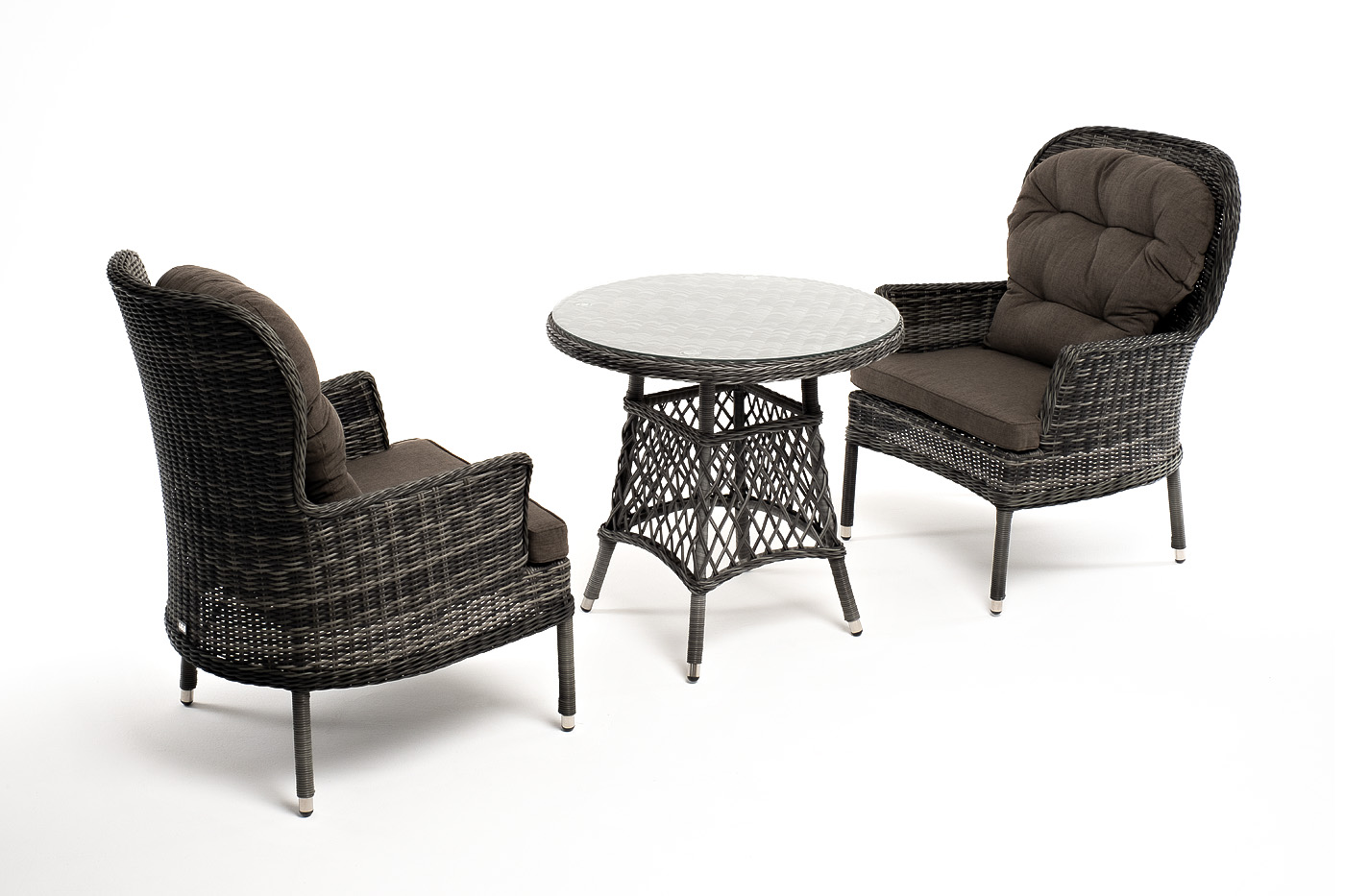 Плетение выполнено вручную круглым искусственным ротангом графитового цвета, кресло укомплектовано подушками из 100% полиэстера, которые пропитаны специальным составом, обладающим влагоотталкивающим свойством.