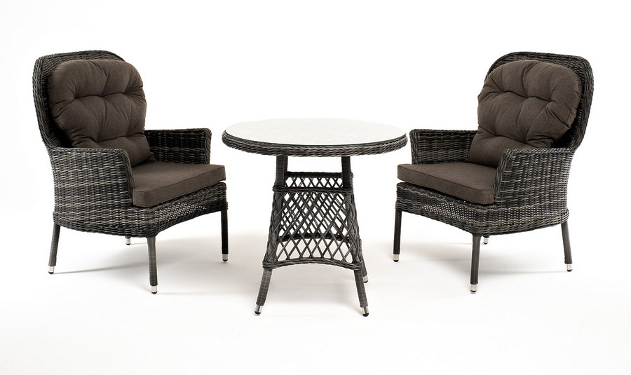Кофейный комплект «Алиса» рассчитан на 2 персоны и подходит для расположения на балконе, в небольших гостиных, на террасе и других местах с ограниченным пространством. В основе каркас из алюминия.