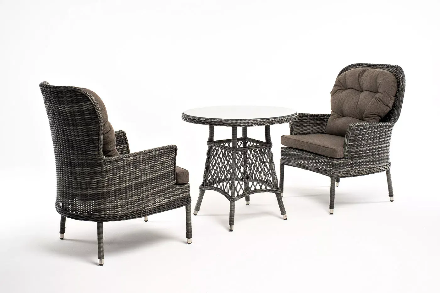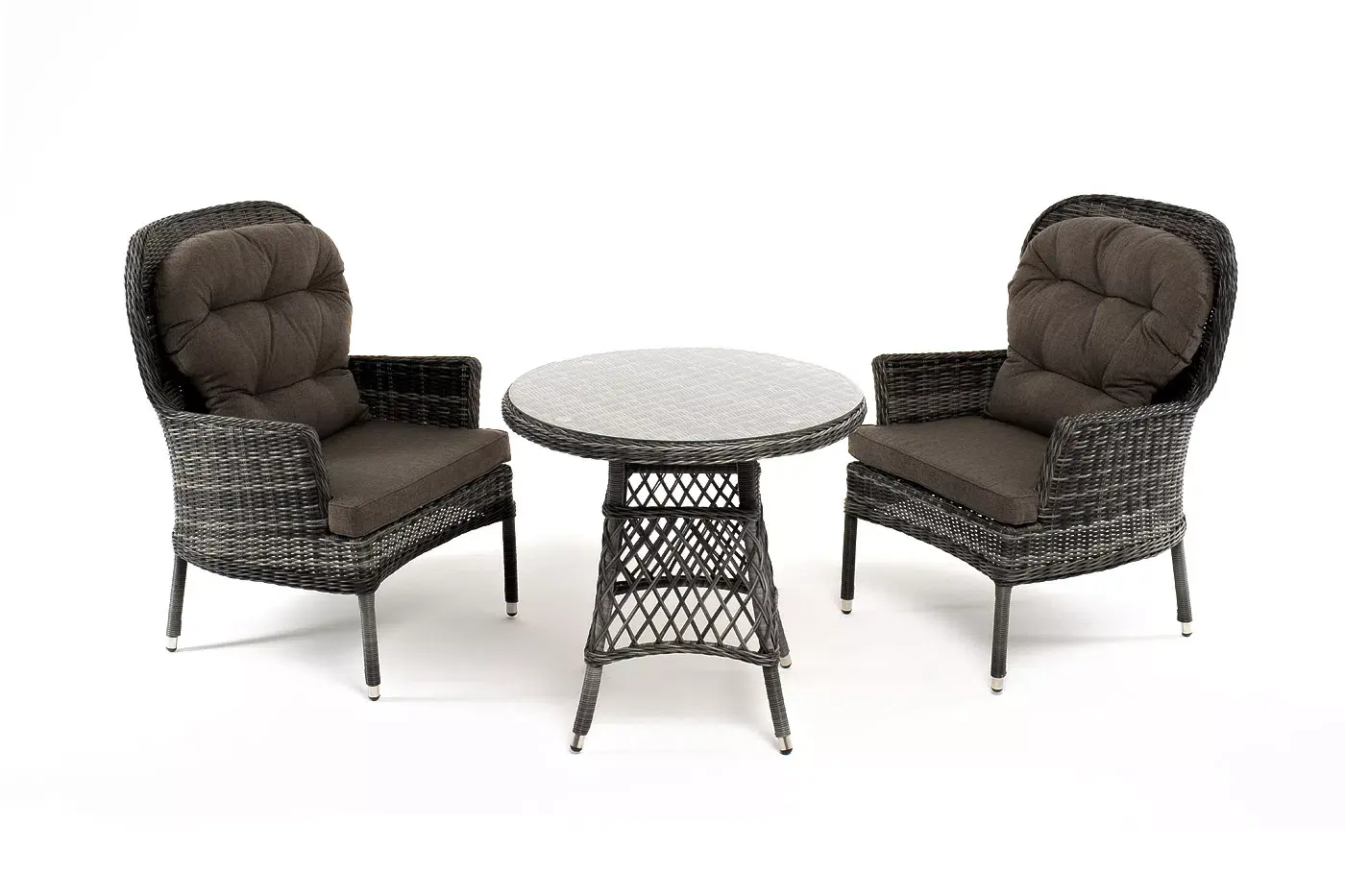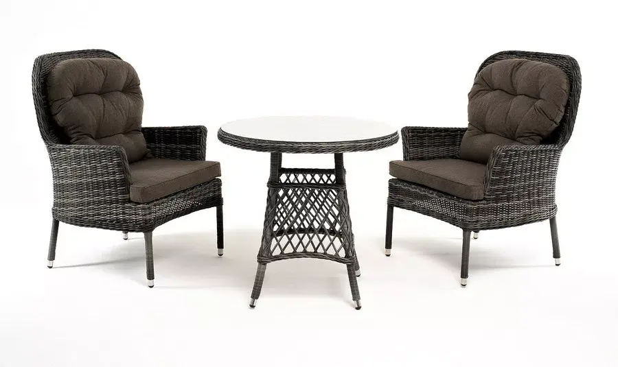 Плетение выполнено вручную круглым искусственным ротангом графитового цвета, кресло укомплектовано подушками из 100% полиэстера, которые пропитаны специальным составом, обладающим влагоотталкивающим свойством.