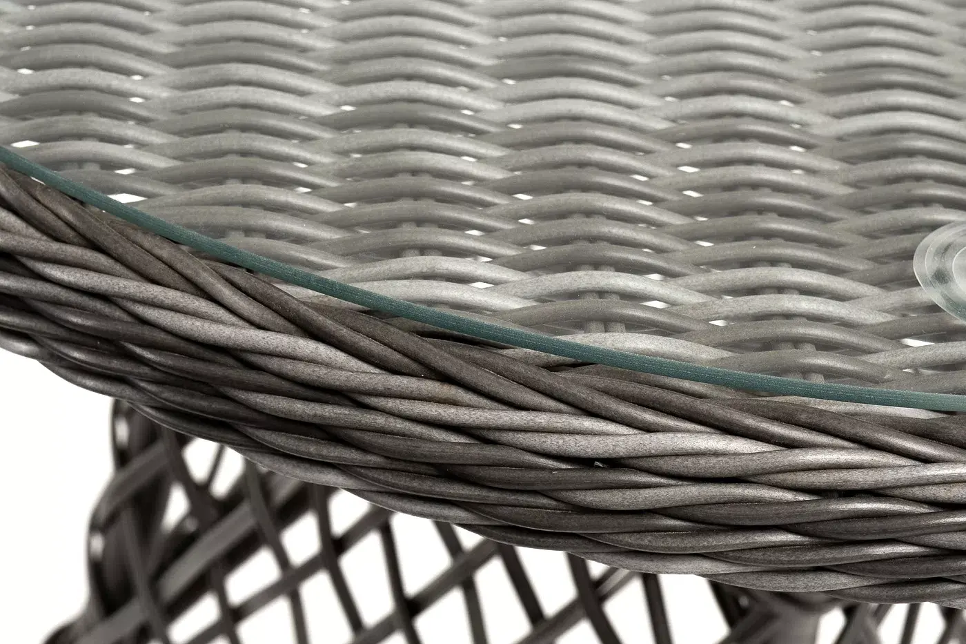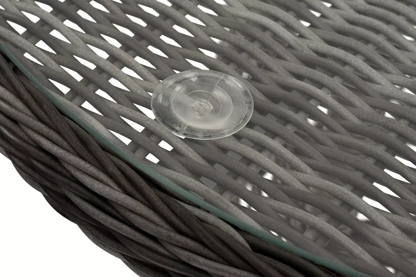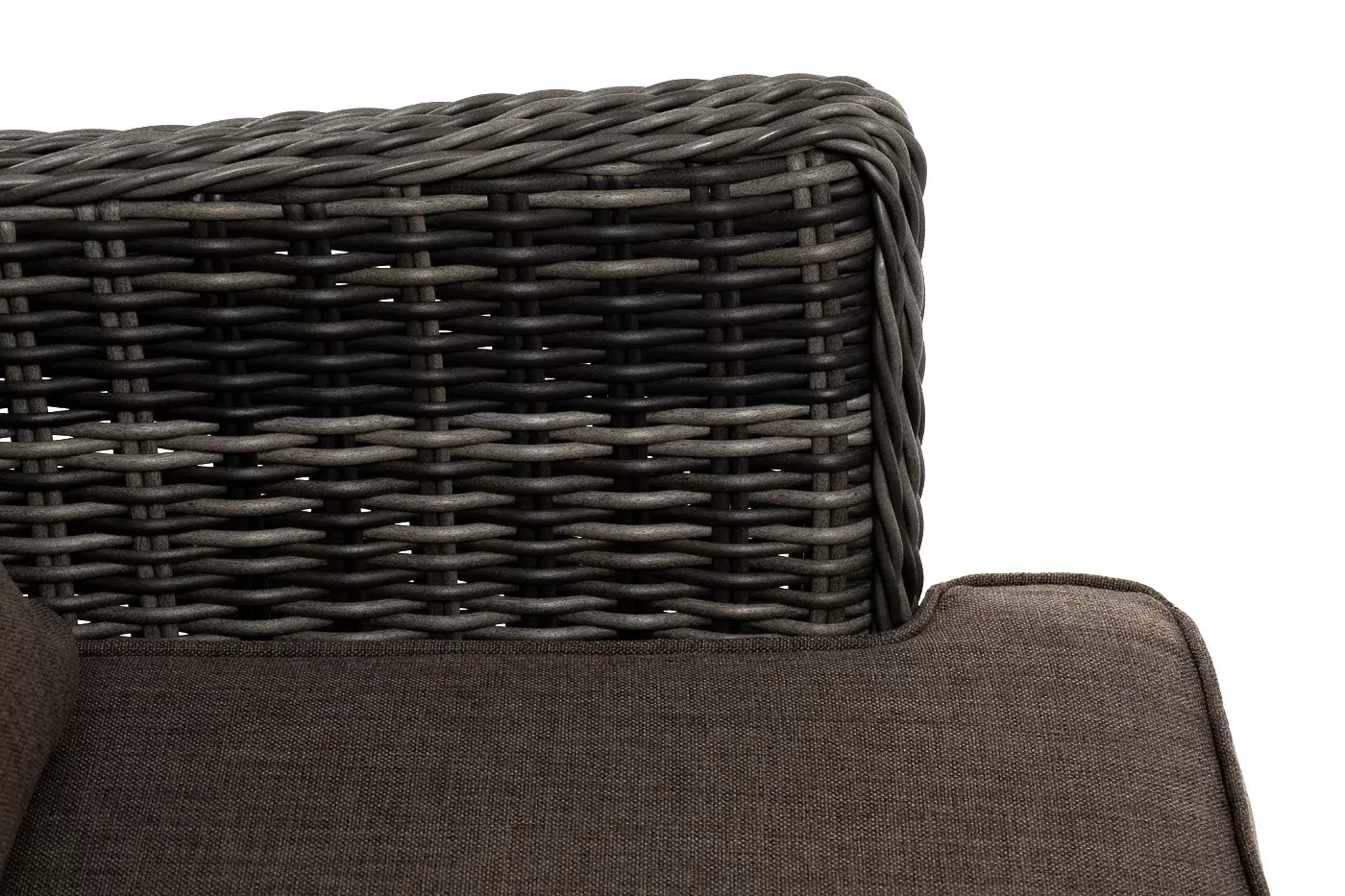 Плетение выполнено вручную круглым искусственным ротангом графитового цвета, кресло укомплектовано подушками из 100% полиэстера, которые пропитаны специальным составом, обладающим влагоотталкивающим свойством.