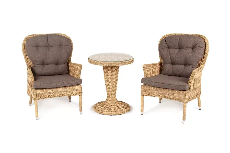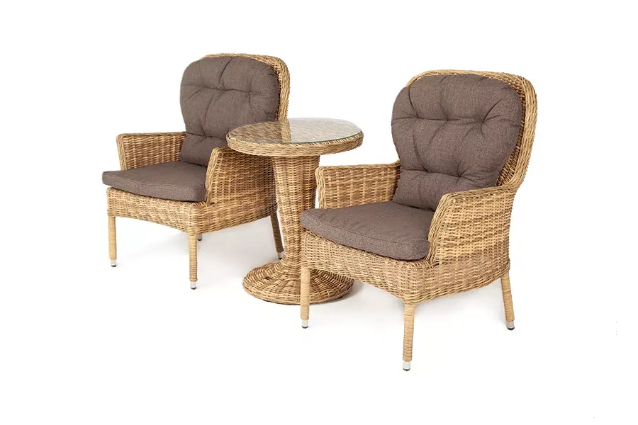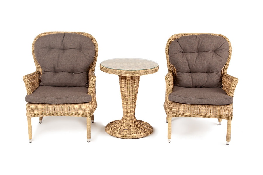 Плетение выполнено вручную искусственным ротангом соломенного цвета, кресло укомплектовано подушками из 100% полиэстера, которые пропитаны специальным составом, обладающим влагоотталкивающим свойством.