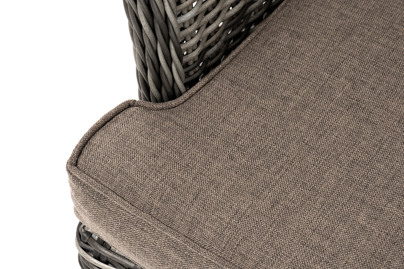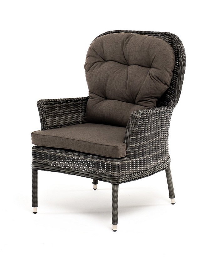В садовое кресло укомплектовывается мягкими подушками. Они пошиты из износостойкого полиэстера серого оттенка с плотностью 300гр/м2. Защитные свойства синтетического материала усиливаются благодаря влагоотталкивающей пропитке.