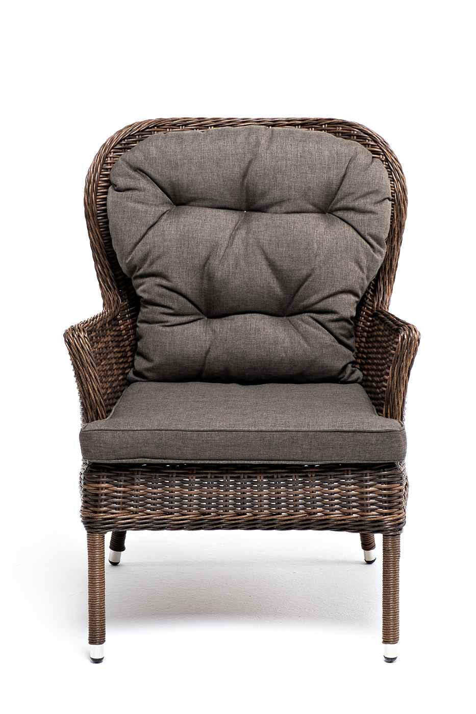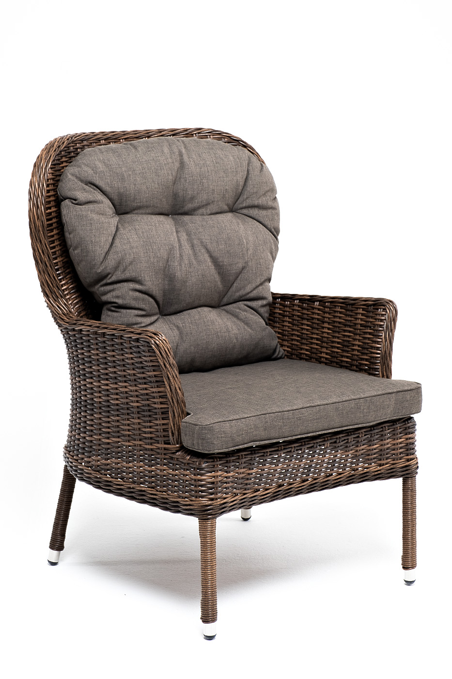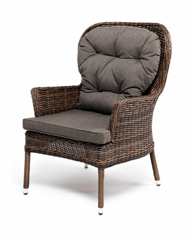 В садовое кресло укомплектовывается мягкими подушками. Они пошиты из износостойкого полиэстера серого оттенка с плотностью 300гр/м2. Защитные свойства синтетического материала усиливаются благодаря влагоотталкивающей пропитке.