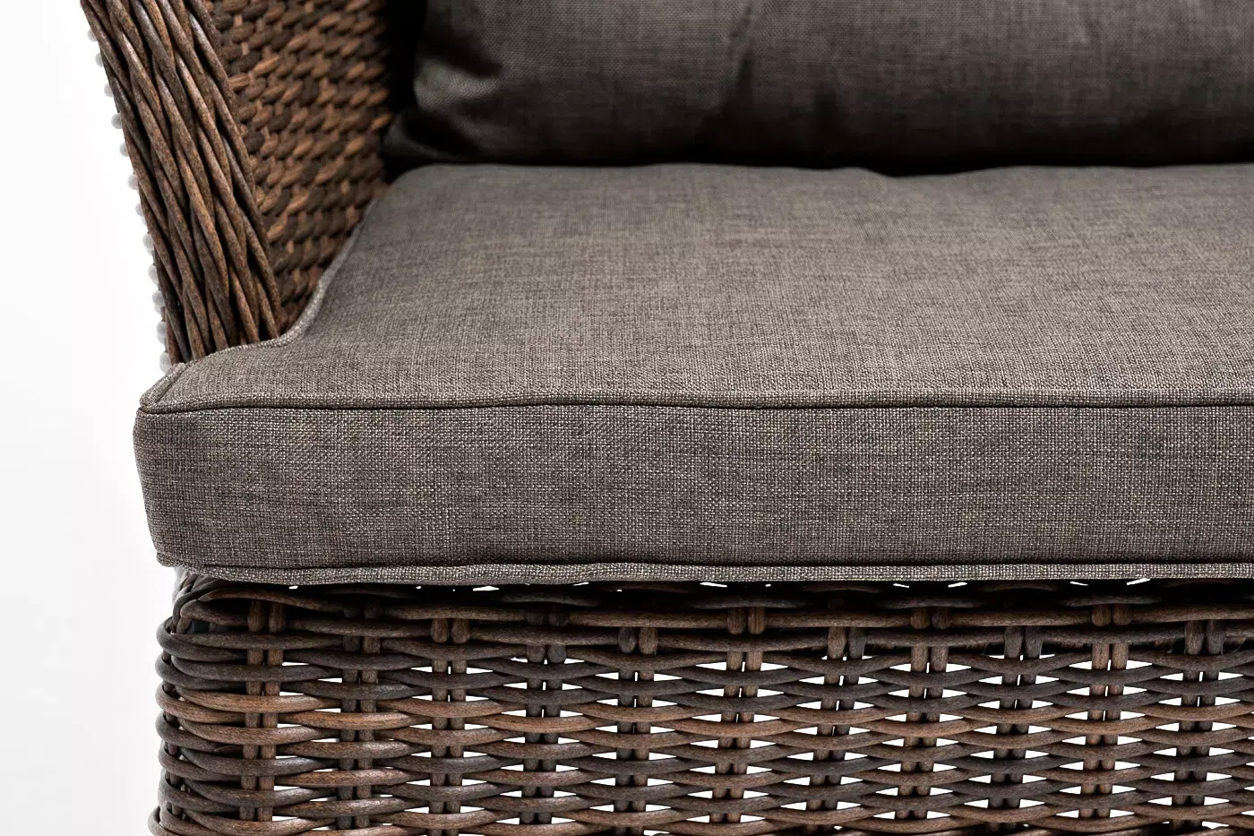 Каркас выполнен из высококачественного алюминия, который оплетен круглым искусственным ротангом коричневого цвета.