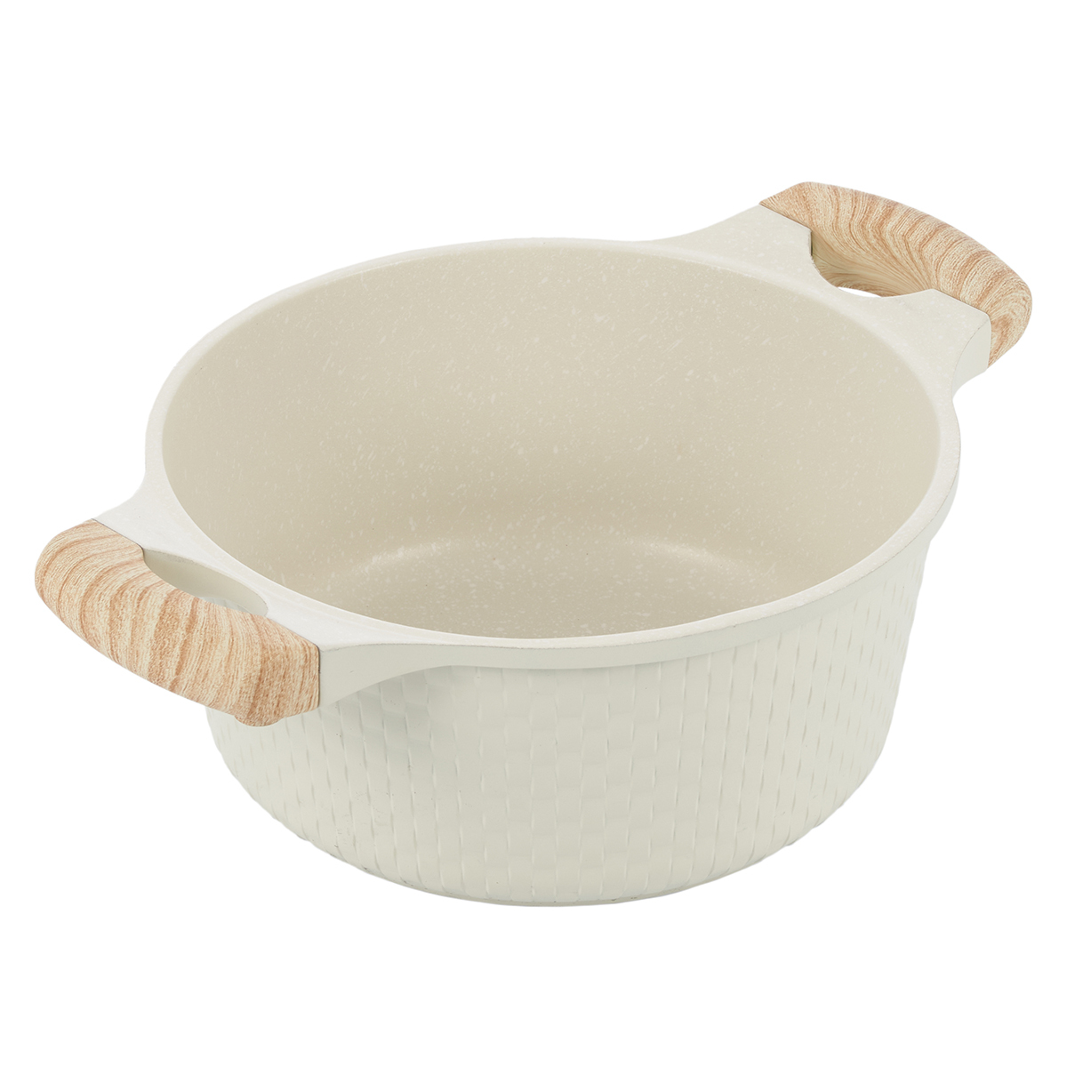 Кастрюля выполнена в оригинальном дизайне, светло-бежевого цвета и рельефным плетением снаружи, внутри с белыми вкраплениями.