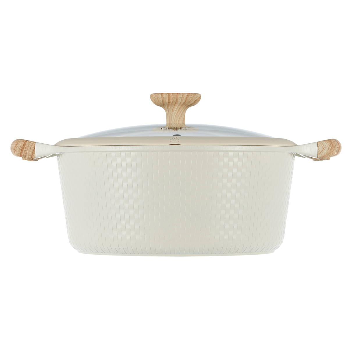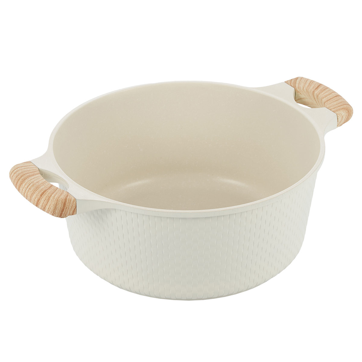 Кастрюля выполнена в оригинальном дизайне, светло-бежевого цвета и рельефным плетением снаружи, внутри с белыми вкраплениями.