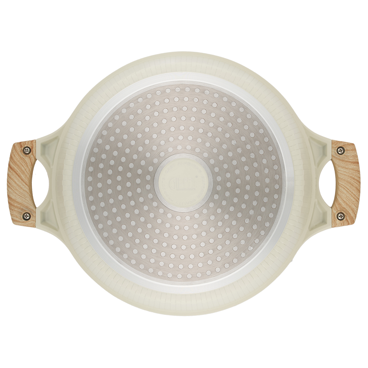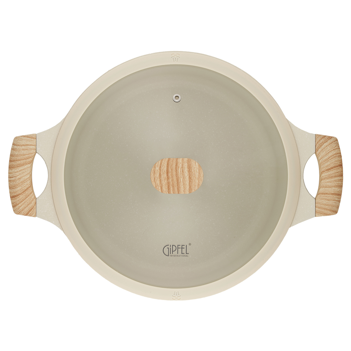 Алюминиевая кастрюля Gipfel Lattice 52652. Размер 28х12,5 см, объем 6,4 л. Изготовлена из литого алюминия с 3-слойным антипригарным мраморным покрытием Whitford QuanTanium, c бакелитовой ручкой с покрытием Soft-touch и стеклянной крышкой. Цвет: светло-бежевый.