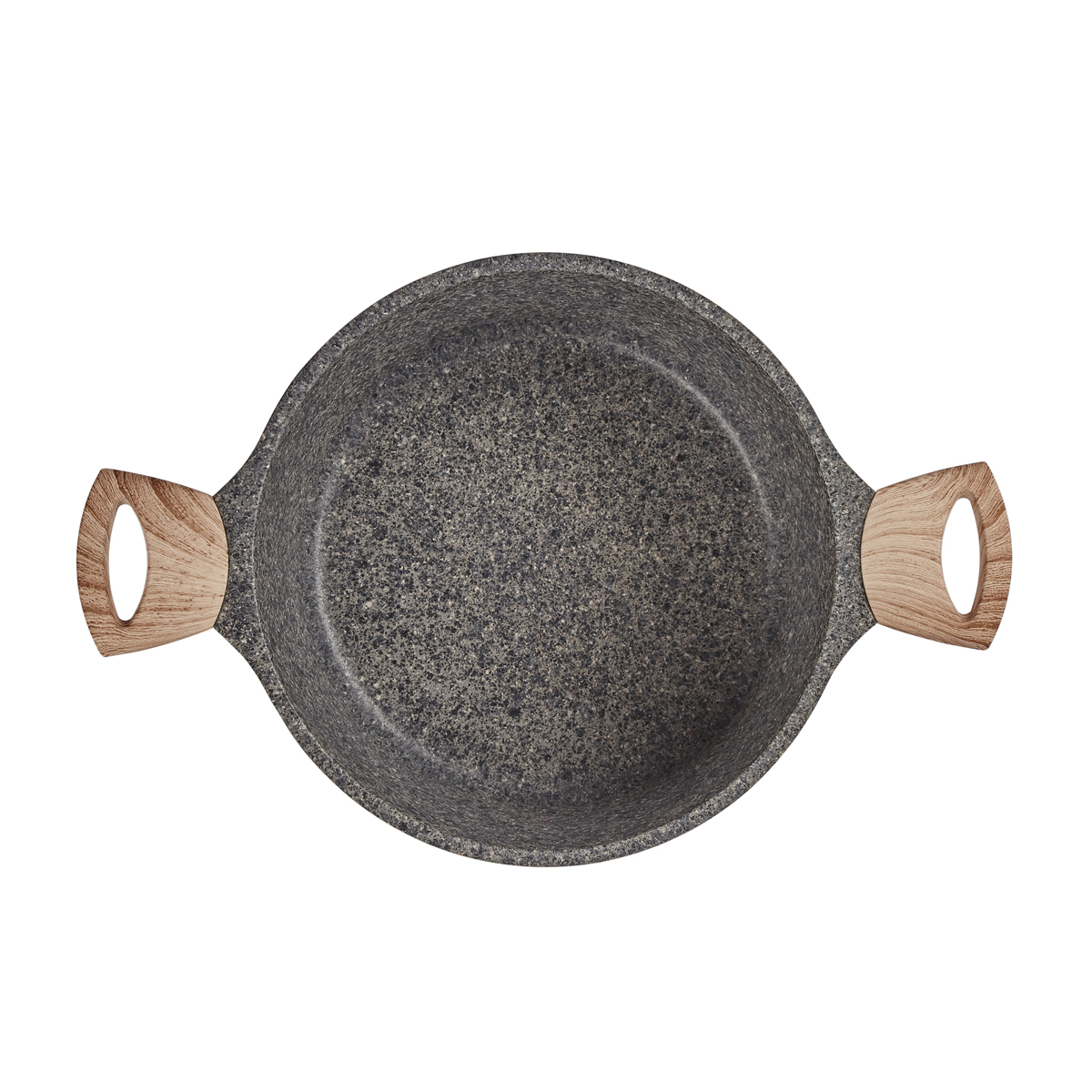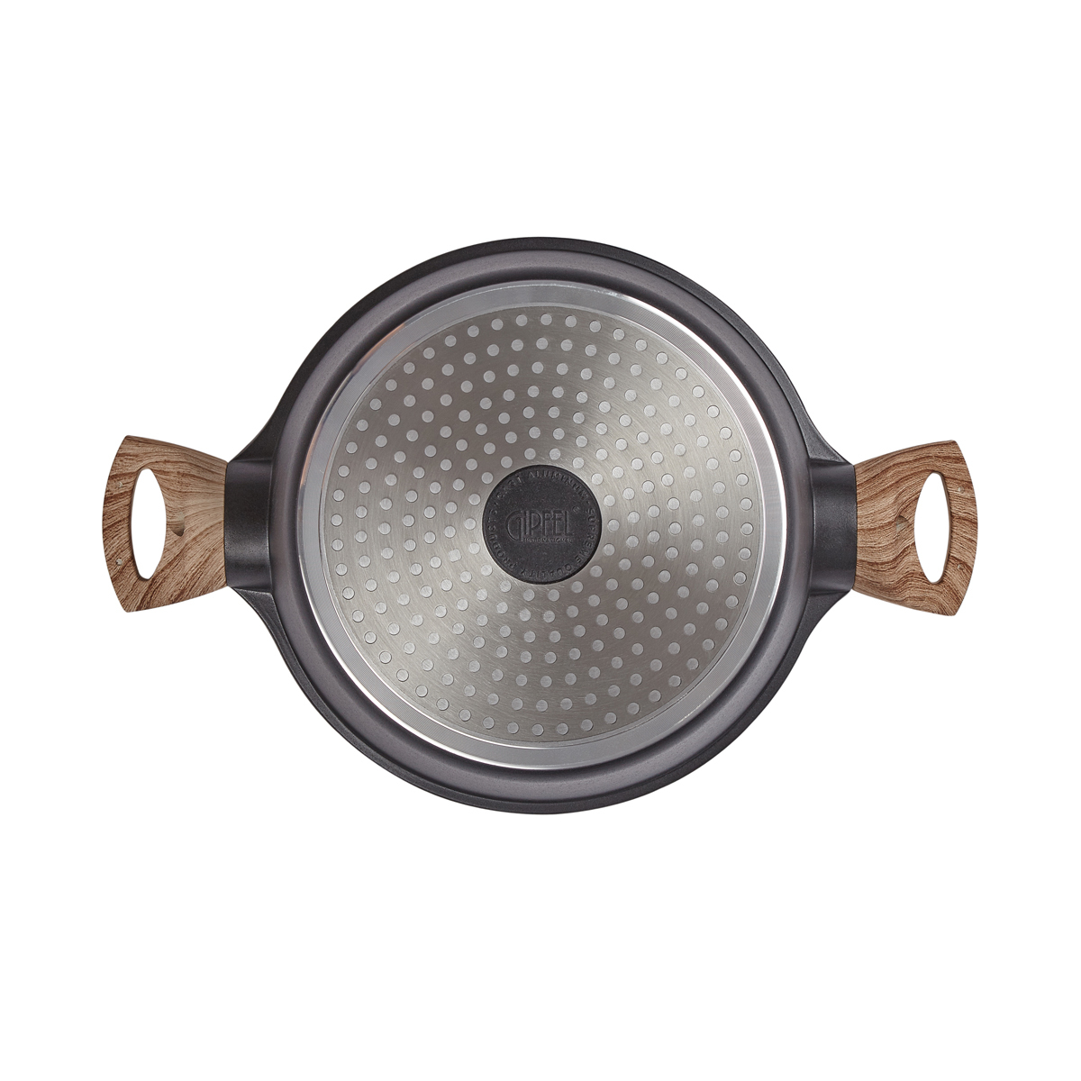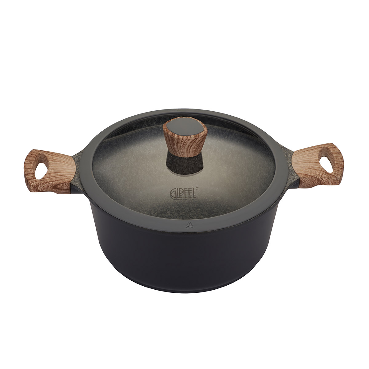 Кастрюля из литого алюминия с бакелитовыми ручками, сделанными под деревянные, а также со стеклянной крышкой. Сделана из литого алюминия, покрытого гранитным антипригарным покрытием Pfluon Granite, объем кастрюли – 4,3 л.