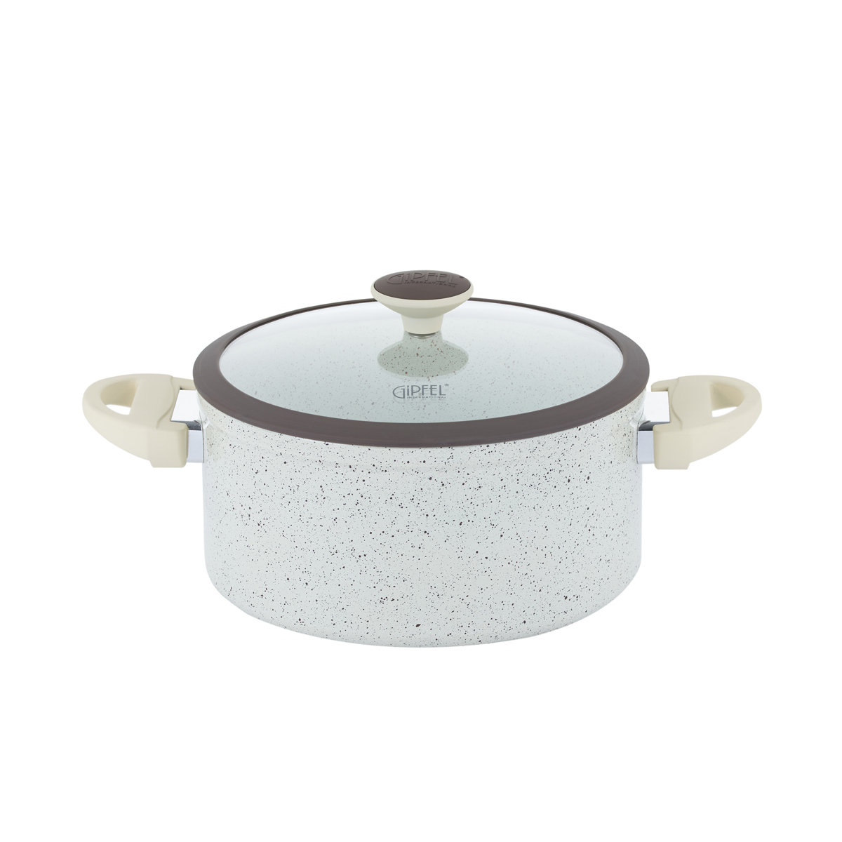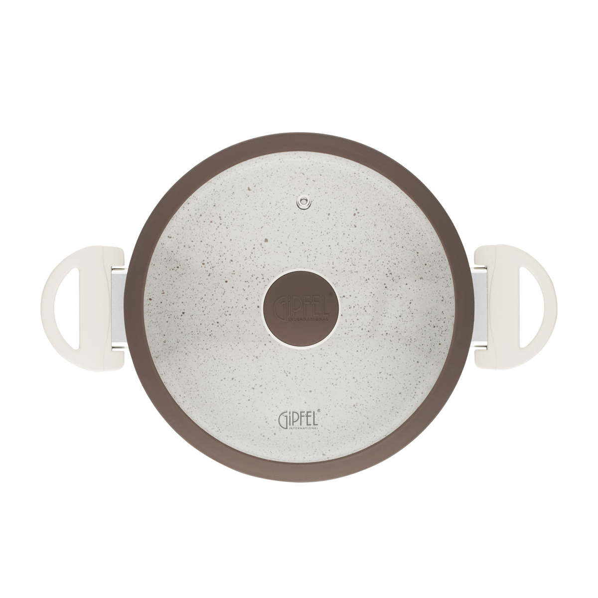 Алюминиевая кастрюля Gipfel Sonrizo 0433. Размер 24 см, объем 5,5 л. Кастрюля в комплекте со стеклянной крышкой с силиконовым ободком. Изготовлена из кованого алюминия. Ручки кастрюли и крышки сделаны из бакелита с покрытием Soft Touch. Внутри антипригарное керамическое покрытие Excilon.