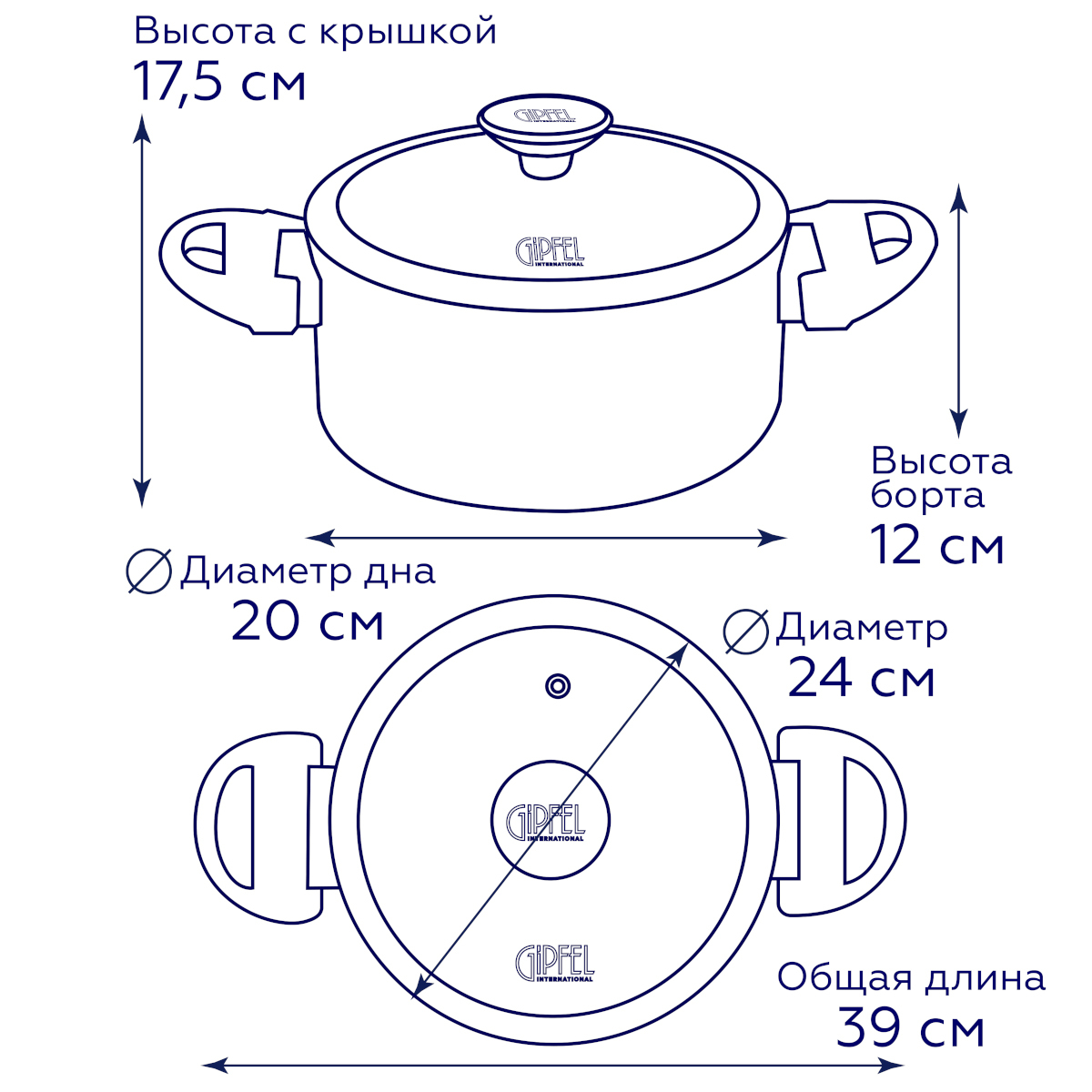 Алюминиевая кастрюля Gipfel Sonrizo 0433 диаметром 24 см, объемом 5,5 л. Высота с крышкой 17,5 см, длина с ручками 39 см. Толщина дна – 4 мм, а стенок – 2 мм.