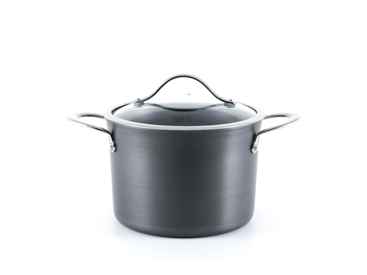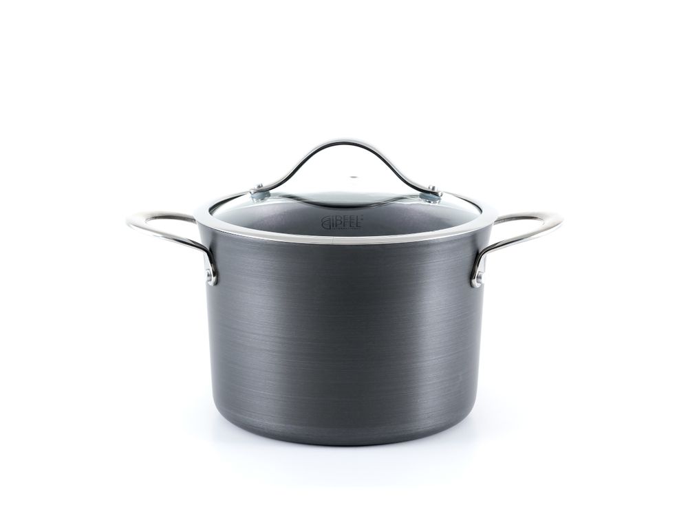 0398 Gipfel Кастрюля SUPER NOVO 20 см со стеклянной крышкой, с антипригарным покрытием Xylan dazzle blue и индукционным дном. Материал: алюминиевый сплав. Толщина: 2,8 мм. Объем: 3,6 л. Размер: 30x23x16 см. Цвет кастрюли: черный. Цвет ручек: стальной.