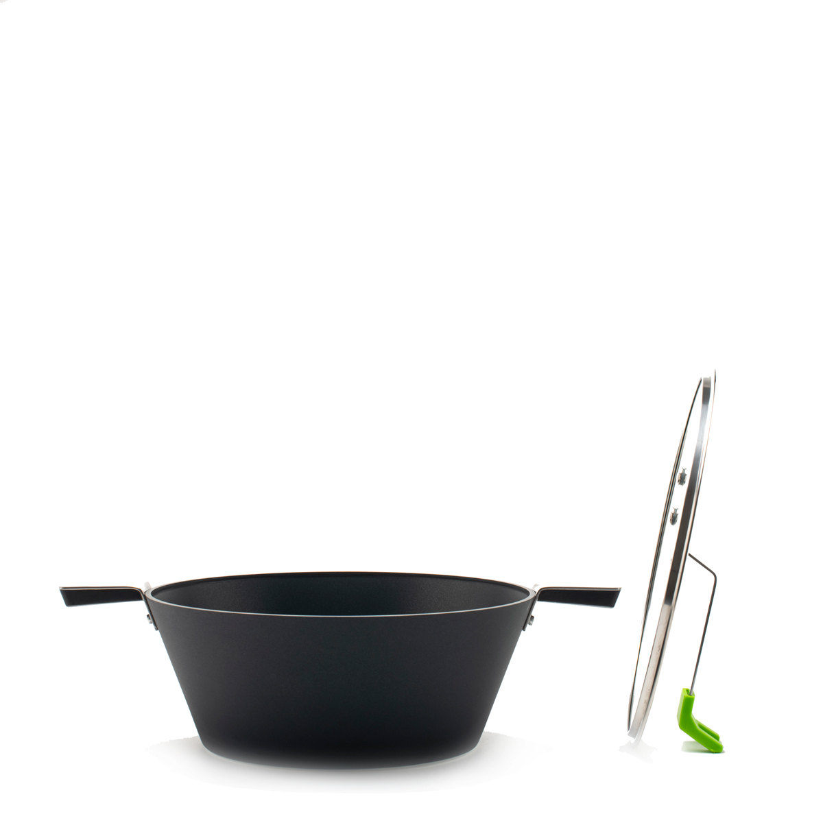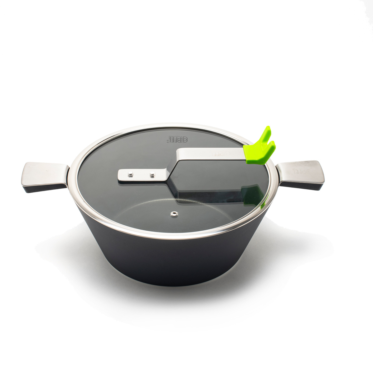 Посуда серии Supreme выполнена из кованого алюминия, экономичного аналога чугуна, обладающего высокими теплопроводными свойствами. Пригорание пищи ко дну и стенкам при готовке исключено благодаря надежному антипригарному покрытию Whitford Xylan, которое прослужит исключительно долго, если отказаться от использования металлических лопаток, царапающих поверхность, в пользу силиконовых и деревянных. Посуда серии Supreme подходит для использования на индукционных плитах. Модель оснащена стеклянной крышкой, в которой имеется специальная подставка для половника. Объем данной кастрюли составляет 5 литров.