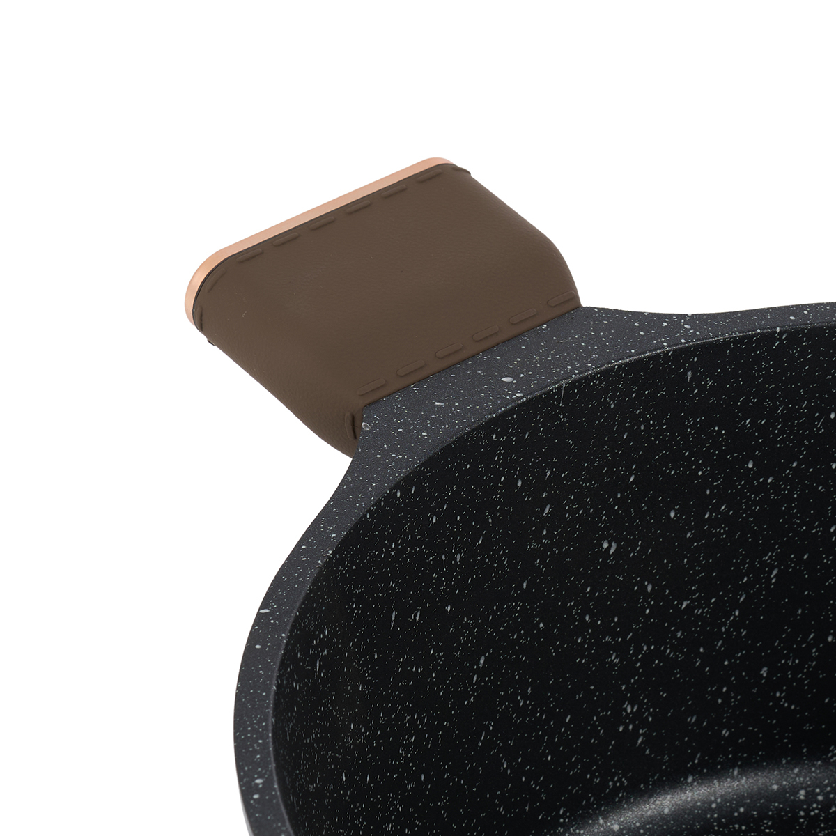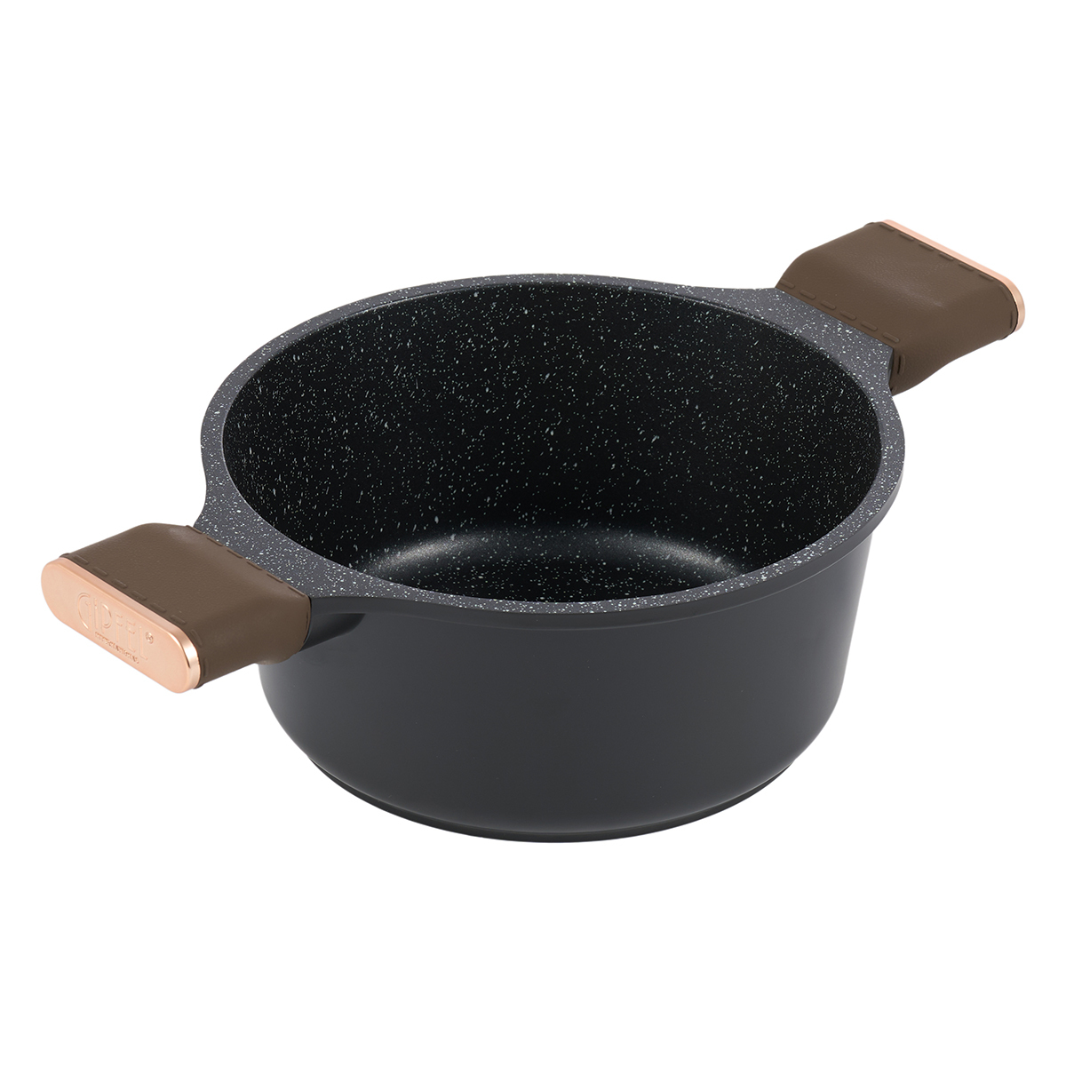 Кастрюля выполнена в оригинальном дизайне в черно-коричневом цвете, внутри с белыми вкраплениями.