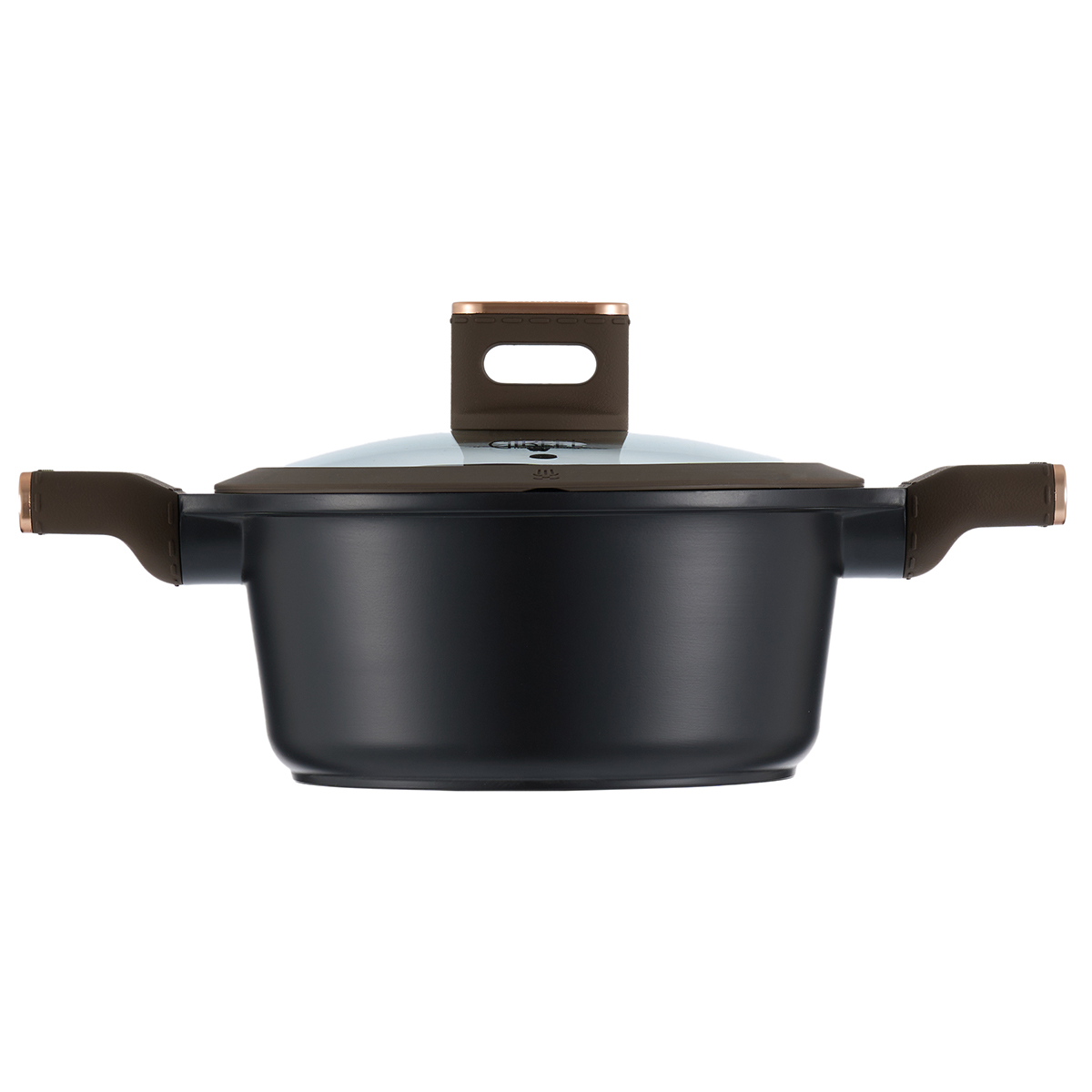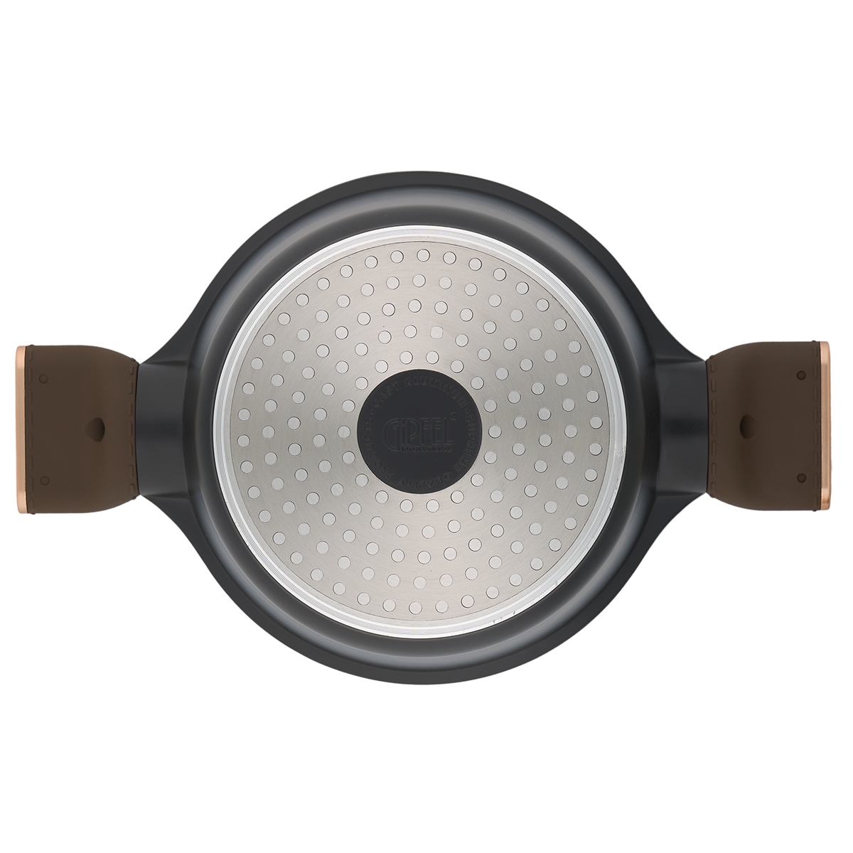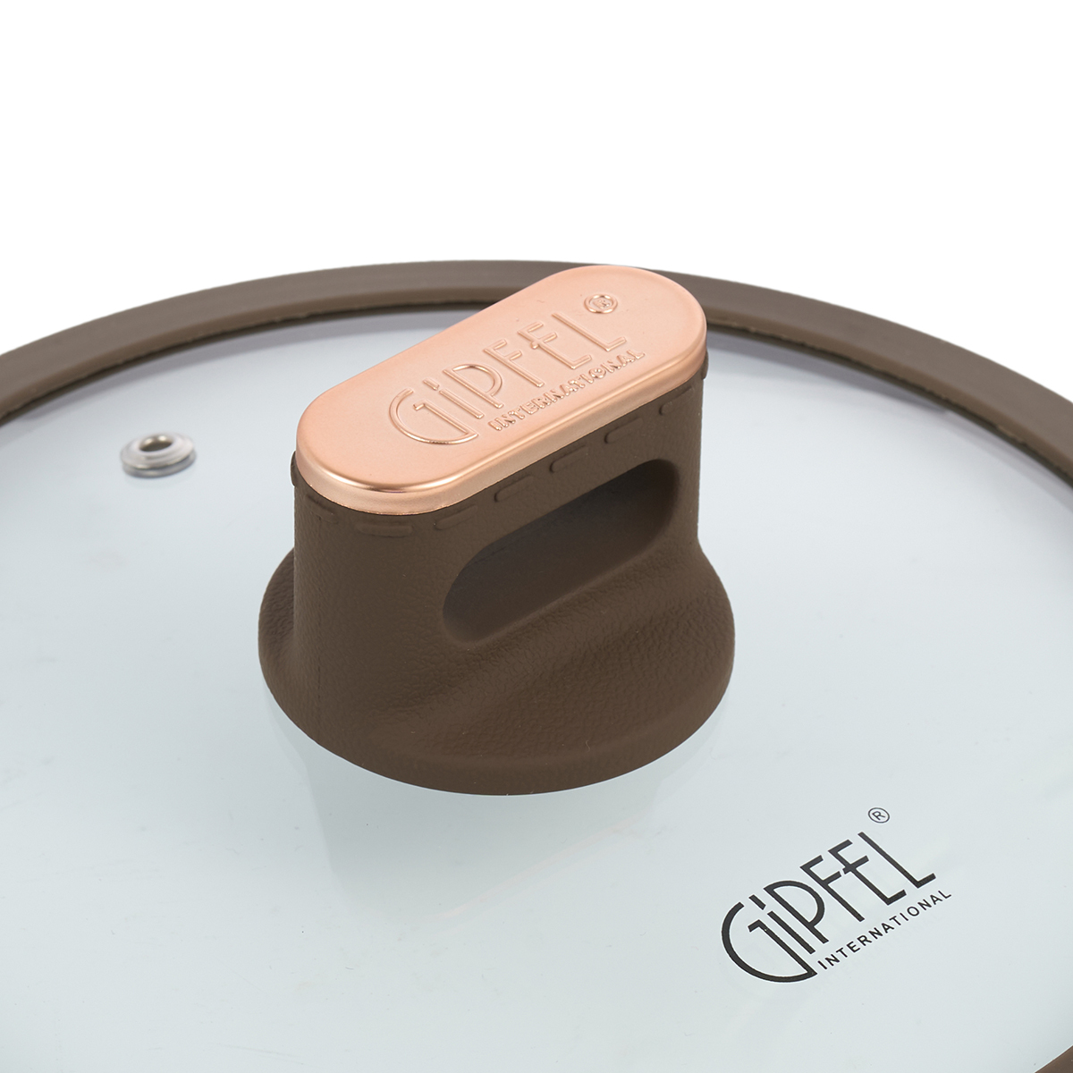 Стильные бакелитовые ручки с покрытием Soft Touch не нагреваются и не скользят в руке. Ручки стилизованы под кожаное покрытие, по краям отделаны вставкой цвета розовое золото с нанесенным логотипом Gipfel, что придает им статусный вид.