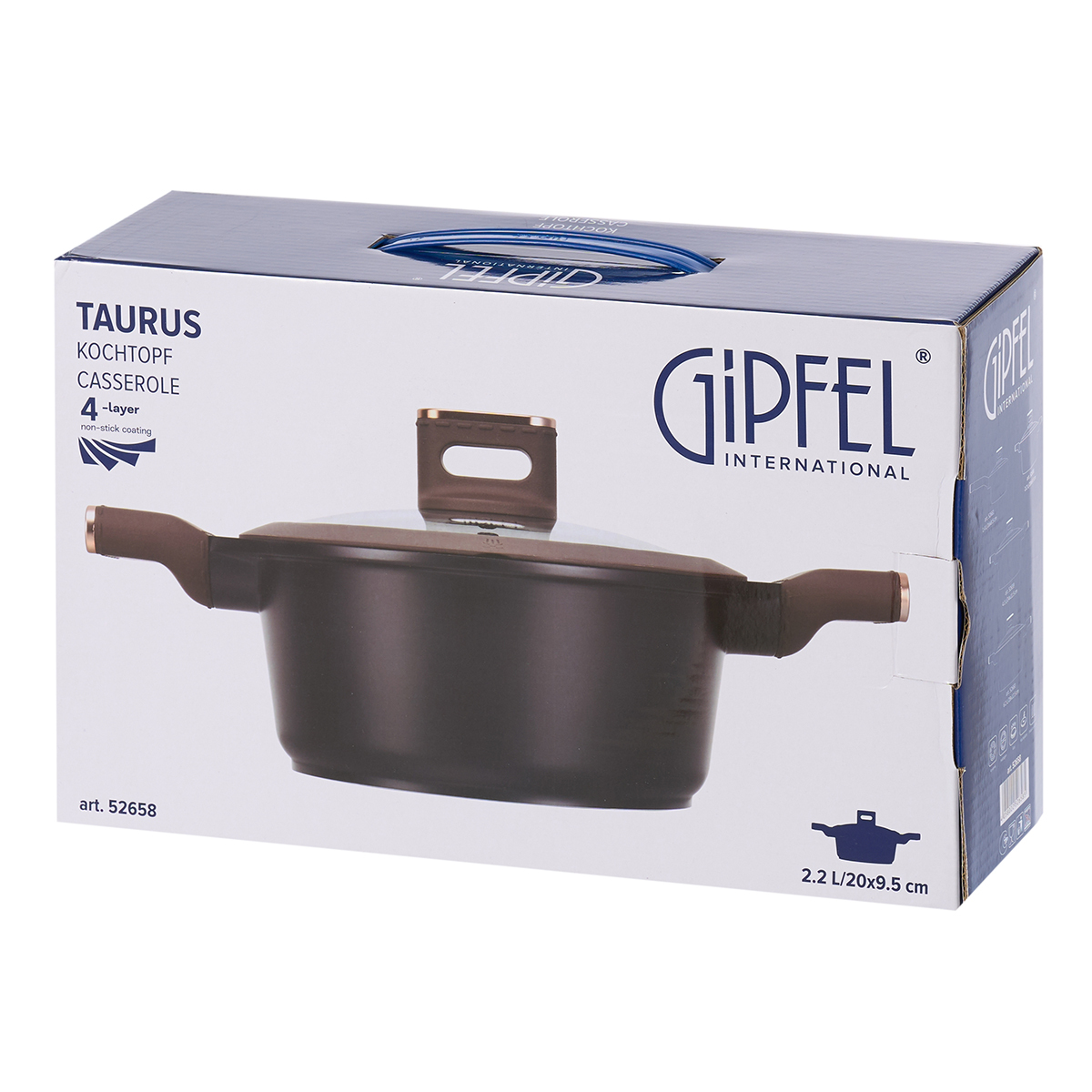 Алюминиевая кастрюля Gipfel Taurus 52658. Размер 20х9,5 см. Изготовлена из литого алюминия с 4-слойным антипригарным мраморным покрытием Whitford QuanTanium, c бакелитовой ручкой с покрытием Soft-touch. Цвет: черный, коричневый.