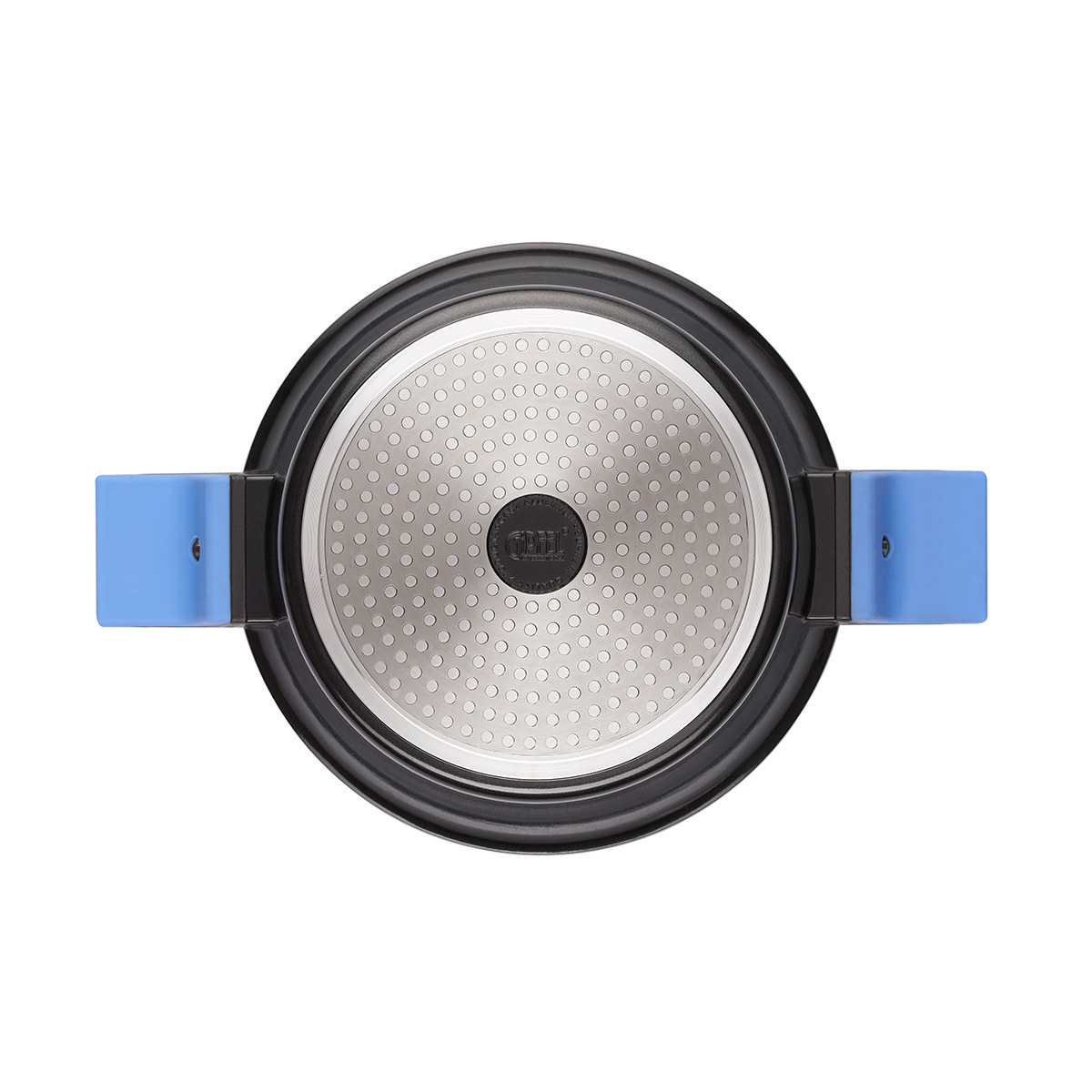 Характерной особенностью посуды серии TIFFI является синий цвет ручек посуды, причем кастрюли серии оснащены крышками, чьи ручки также изготовлены в синем цвете. Корпус посуды изготовлен из литого алюминия и покрыт трехслойным антипригарным покрытием. Объем данной кастрюли составляет 5 литров.