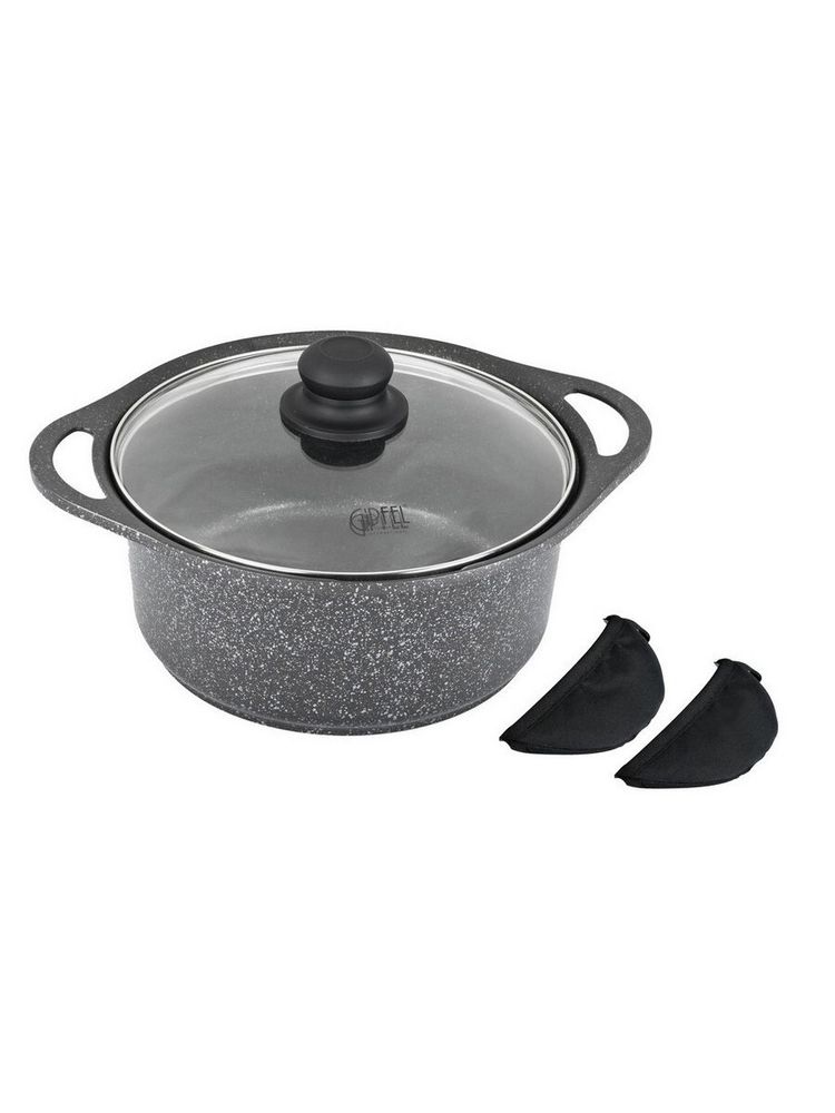 Алюминиевая кастрюля Gipfel Zenit 0510. Размер 24x11,3 см, объем 4,3 л. В комплекте со стеклянной крышкой. Кастрюля изготовлена из литого алюминия, имеет мраморное антипригарное покрытие. Ручки съемные силиконовые, не нагреваются во время готовки. У кастрюли индукционное дно. Упакована в фирменную подарочную коробку.