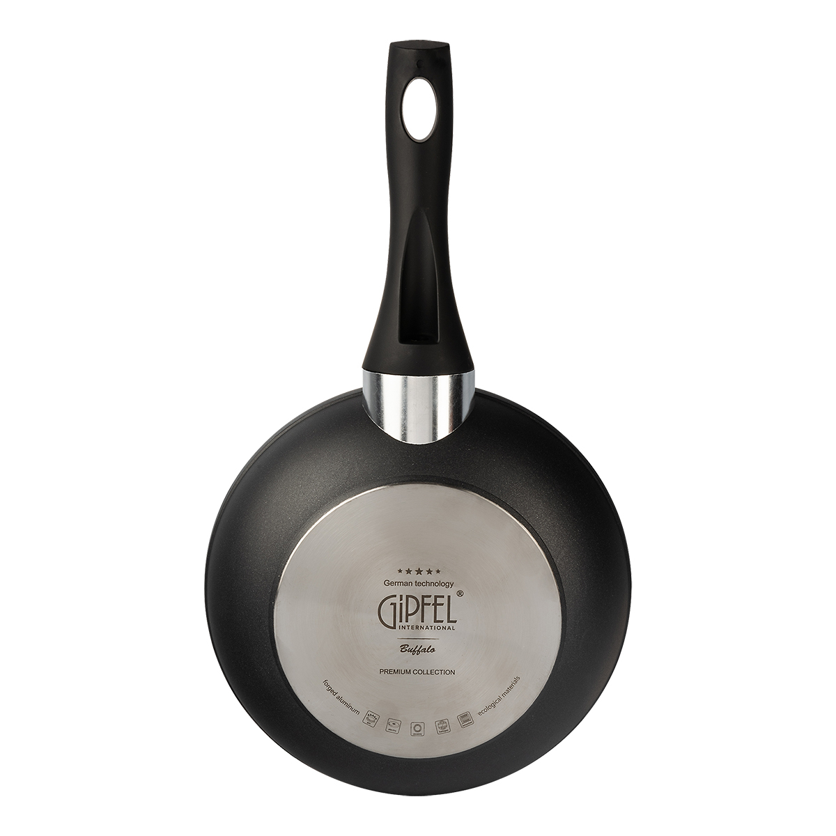 Сковорода Gipfel Buffalo 0109 20х5 см из кованого алюминия. Сковорода с премиальным антипригарным покрытием Teflon Profile. Бакелитовая ручка с покрытием Soft-touch удобно лежит в руке и не нагревается. У сковороды индукционное дно. Толщина стенок 2 мм, толщина дна 4,5 мм. Диаметр дна 13 см.