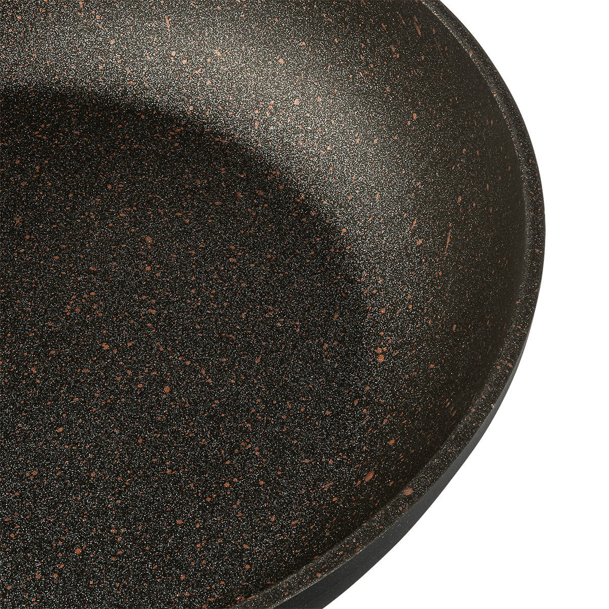 Данная сковорода изготовлена из кованного алюминия, что делает ее прочной, легкой, а также устойчивой к коррозии и деформации корпуса.
