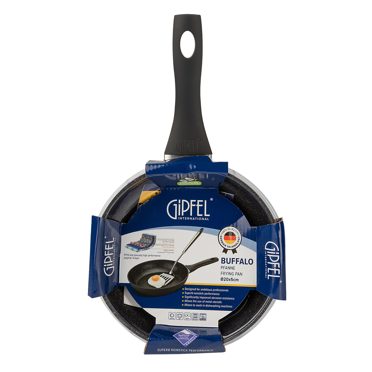 Сковорода Gipfel Buffalo 0109 20х5 см. У сковороды индукционное дно. Толщина стенок 2 мм, толщина дна 4,5 мм. Диаметр дна 13 см.