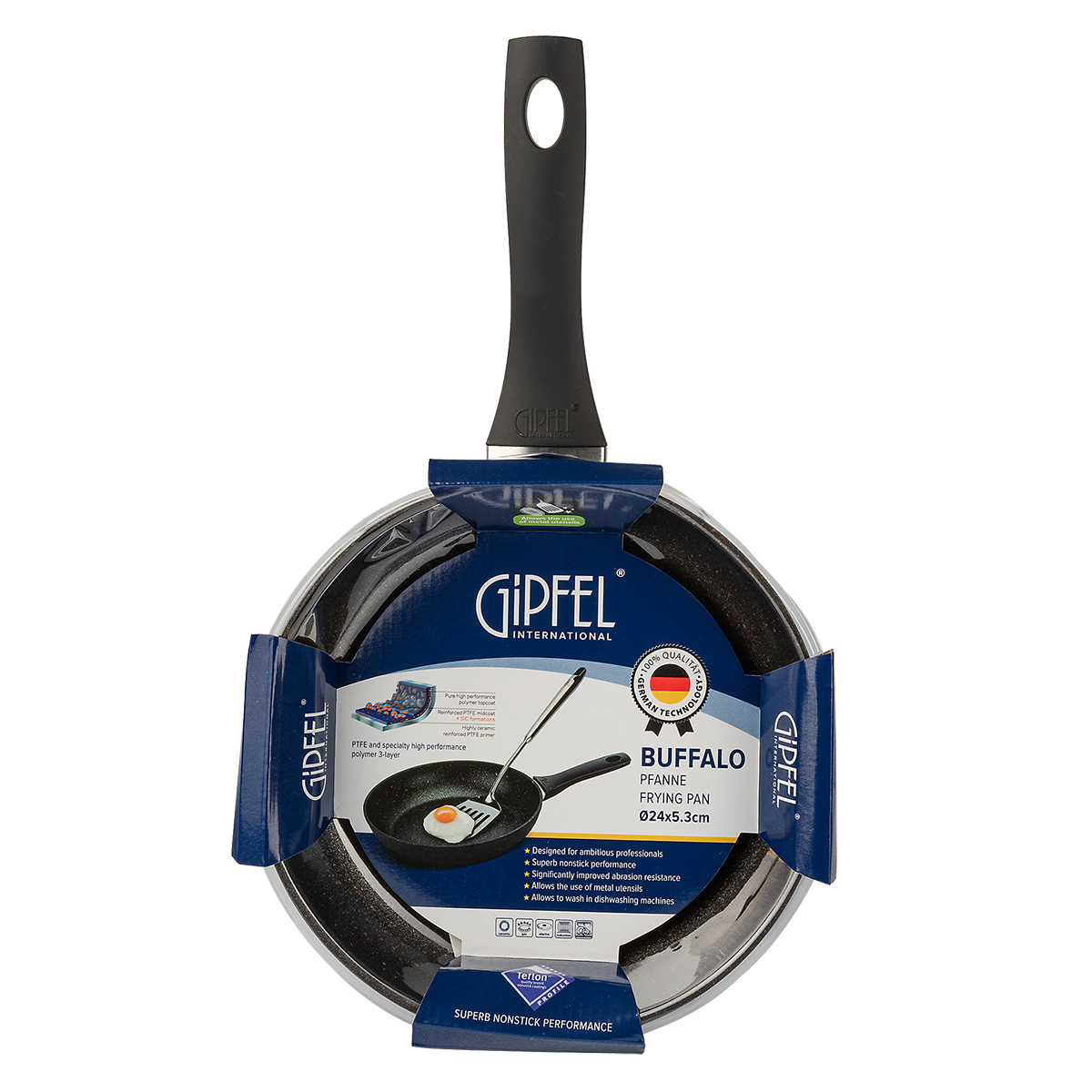 Сковорода Gipfel Buffalo 0110 24х5,3 см из кованого алюминия с премиальным антипригарным покрытием Teflon Profile и индукционным дном. Толщина стенок 2 мм, толщина дна 4,5 мм. Диаметр дна 17,5 см.