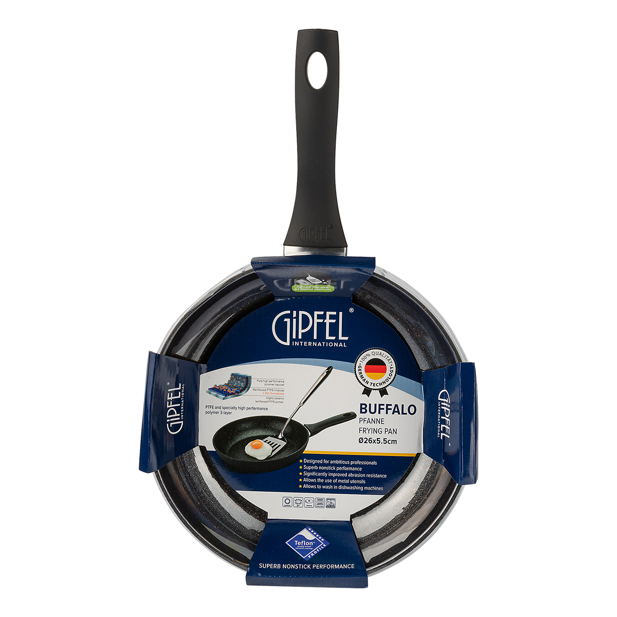 Алюминиевая сковорода Gipfel Buffalo 0111 диаметром 26 см. Сковорода изготовлена из кованого алюминия, оснащена премиальным антипригарным покрытием Teflon Profile. Эргономичная ручка с покрытием Soft-touch не нагревается при готовке.