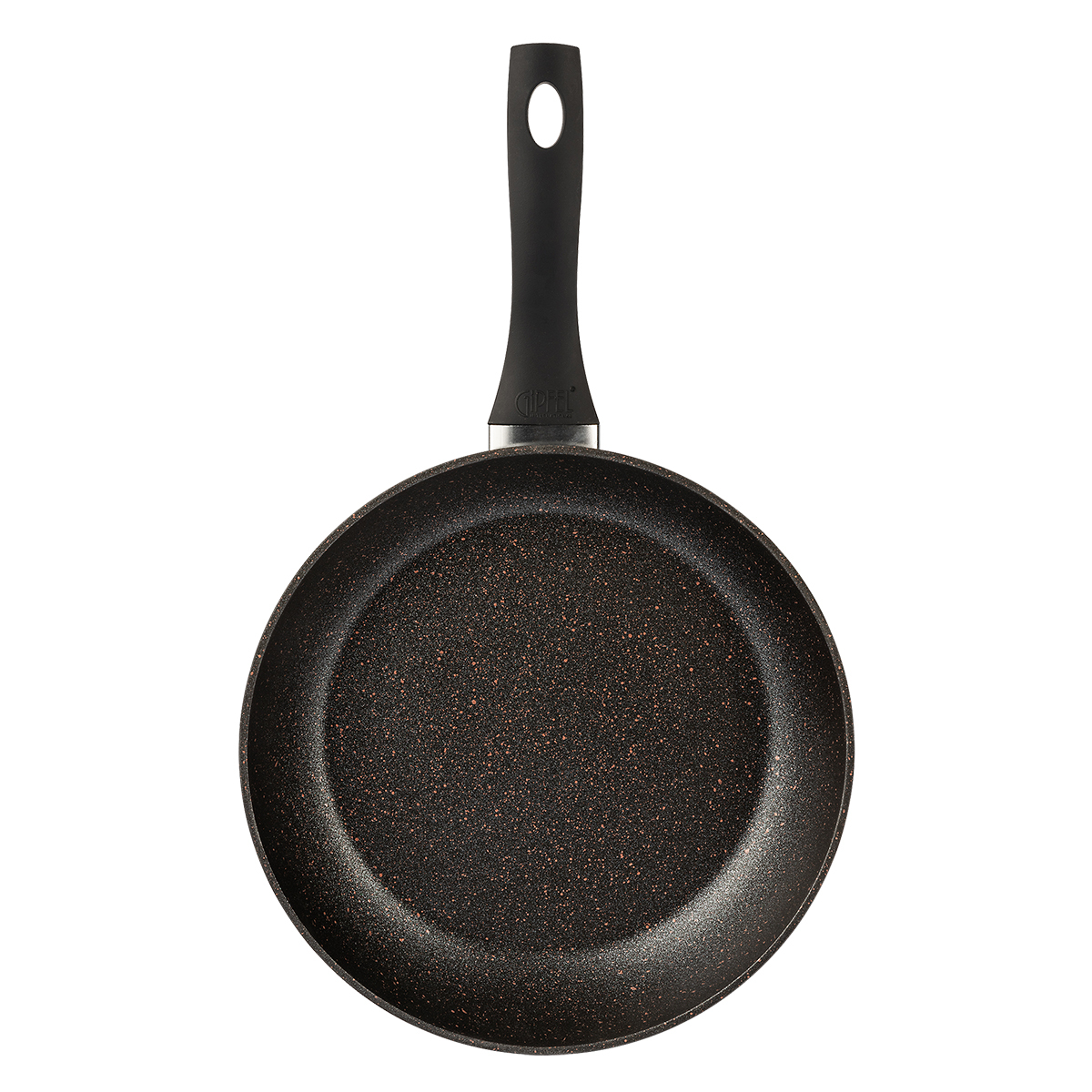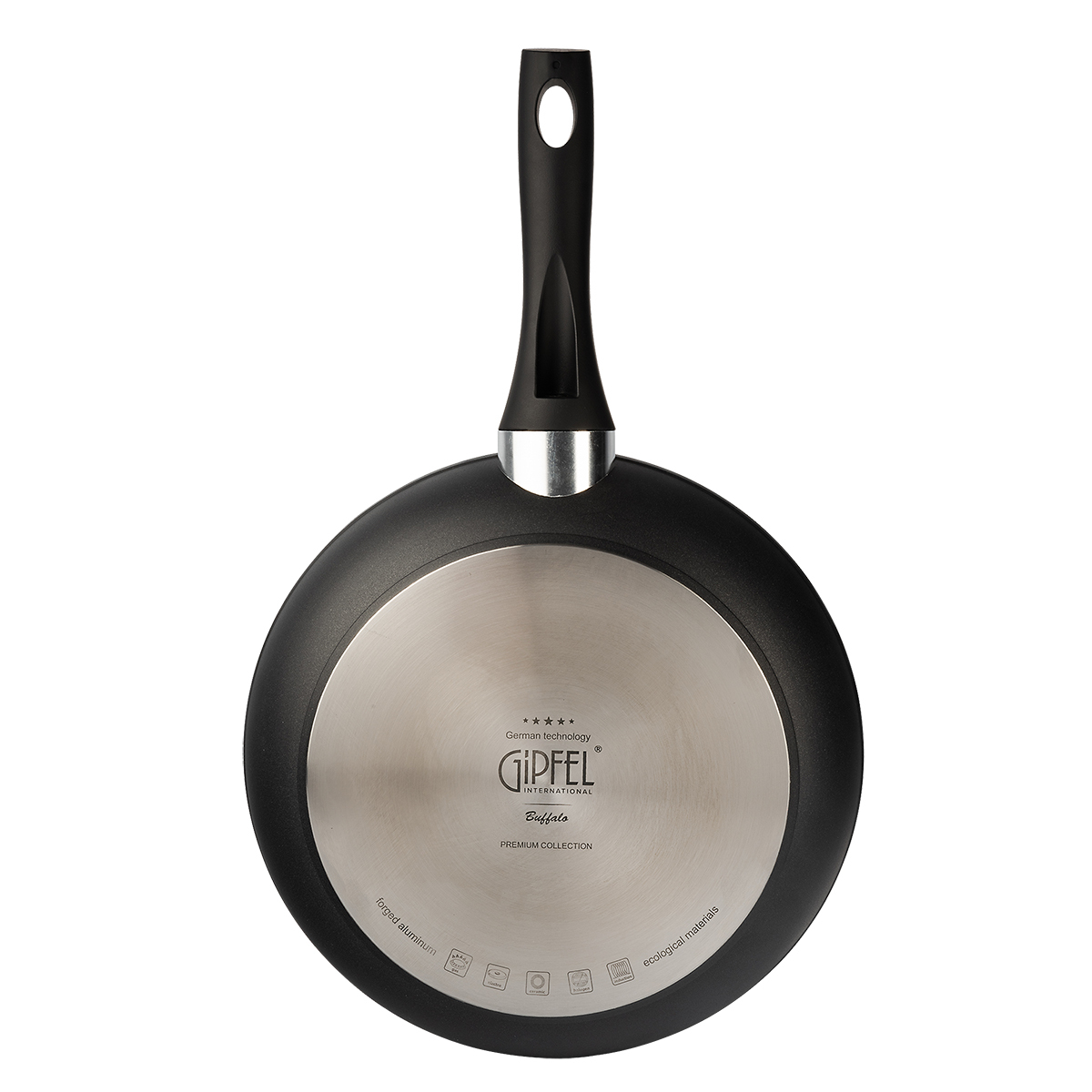 Сковорода Gipfel Buffalo 0112 28х5,5 см из кованого алюминия. Сковорода с премиальным антипригарным покрытием Teflon Profile. Бакелитовая ручка с покрытием Soft-touch удобно лежит в руке и не нагревается. У сковороды индукционное дно. Толщина стенок 2 мм, толщина дна 4,5 мм. Диаметр дна 21,5 см.