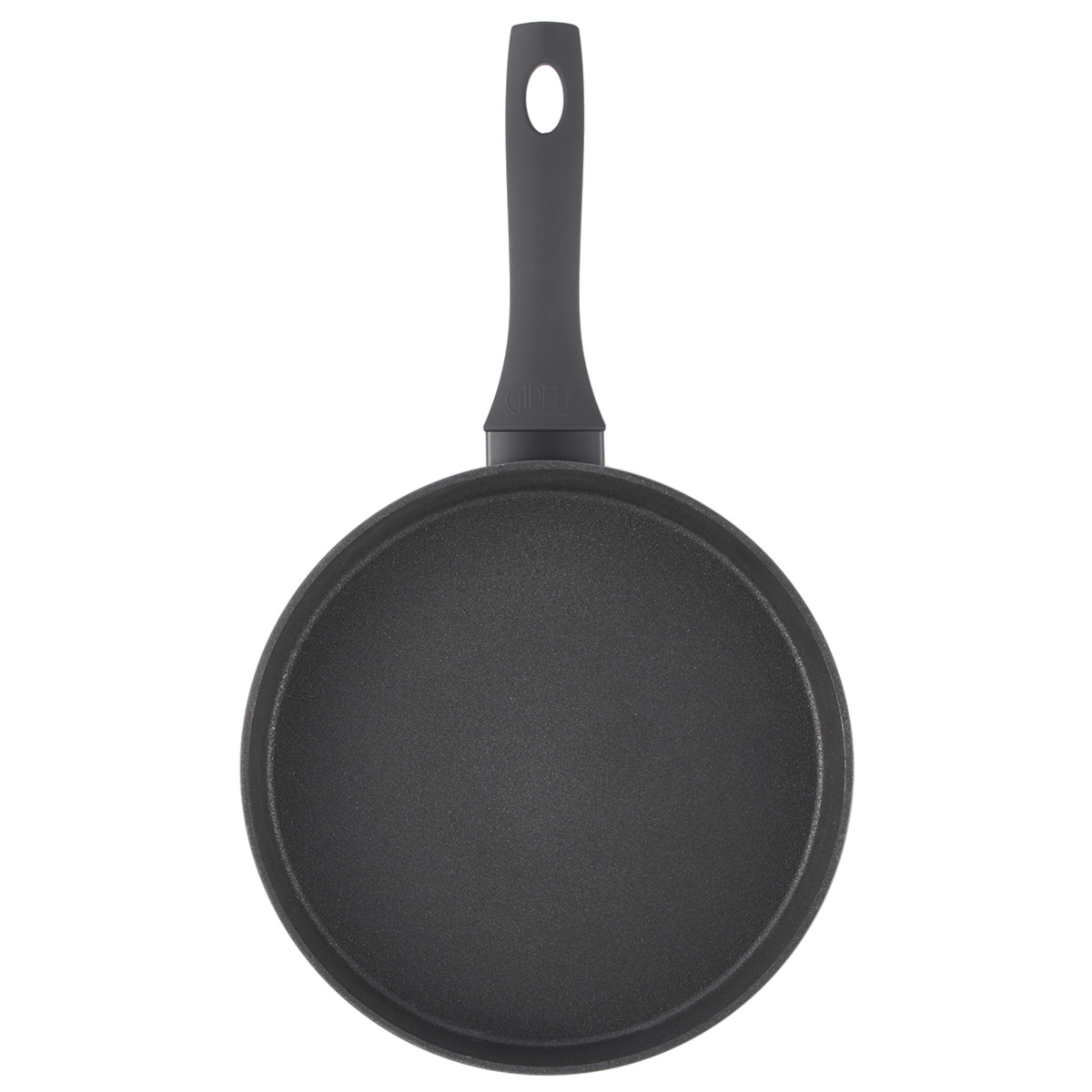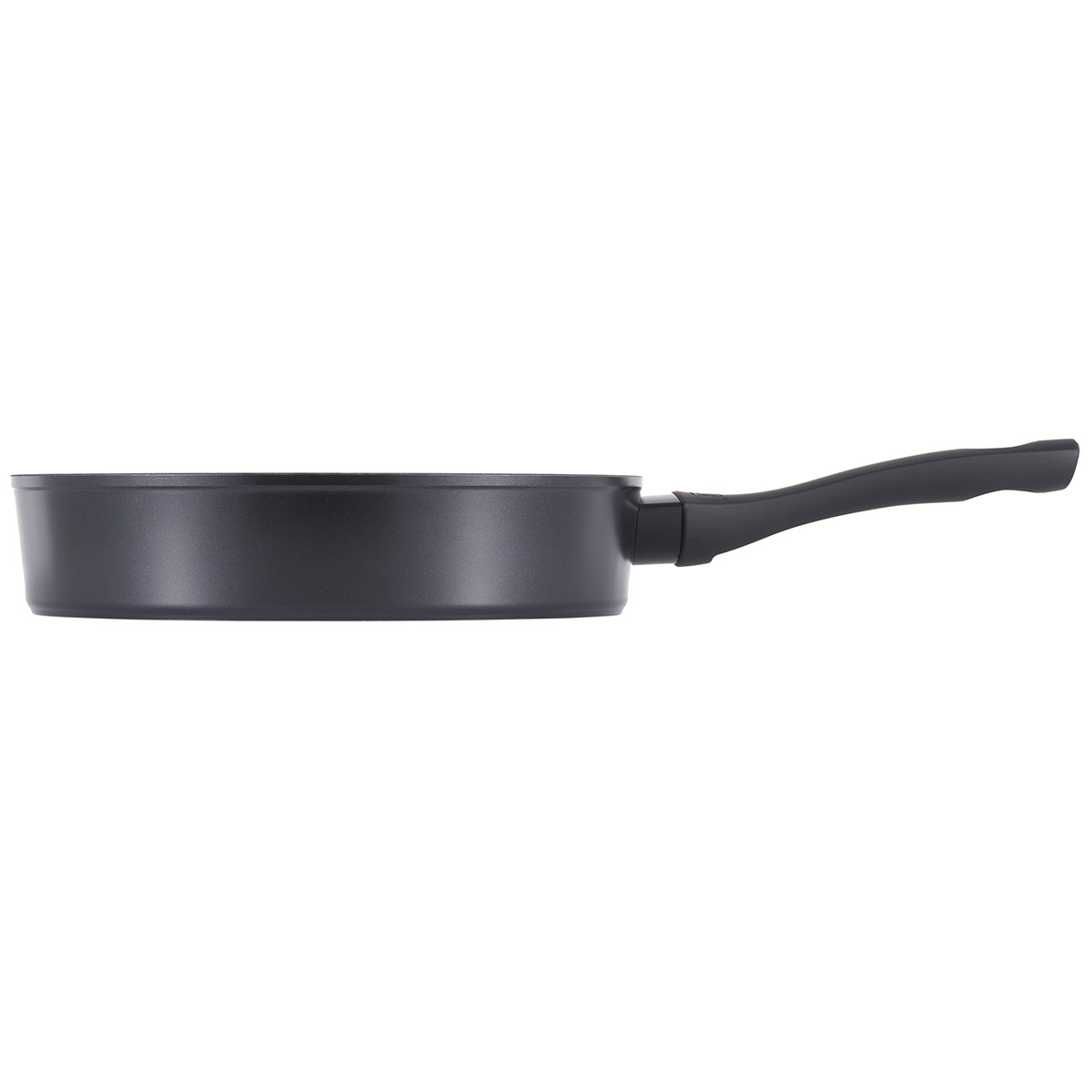 Сковорода выполнена в лаконичном дизайне черного цвета. Бакелитовая ручка с покрытием Soft Touch не скользит в руке и не нагревается при использовании сковороды на плите. Толщина дна: 4,0 мм, толщина стенок: 2,5 мм.