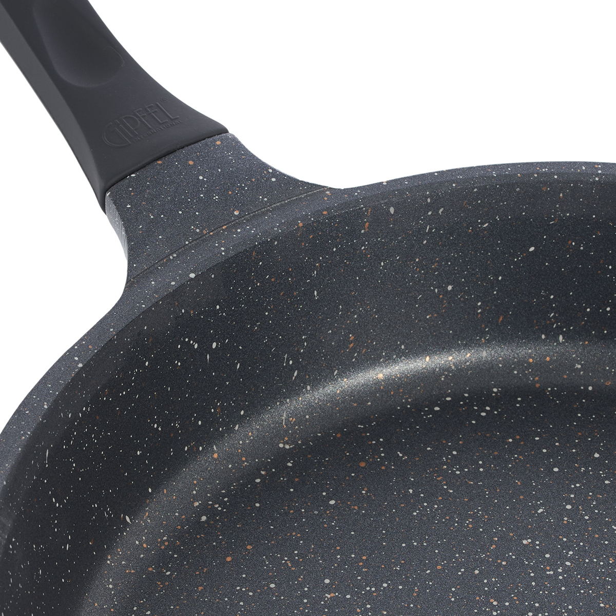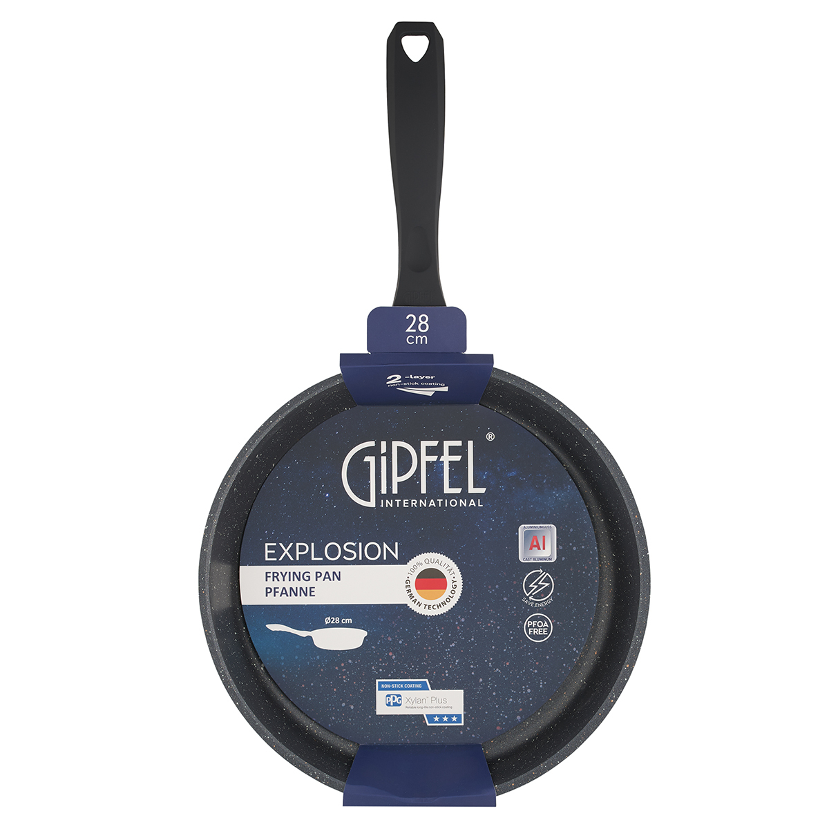 Алюминиевая сковорода Gipfel Explosion 0476. Диаметр 28 см. Высота 5,5 см. Сковорода из литого алюминия с антипригарным покрытием Whitford Xylan Plus. Бакелитовая ручка не нагревается.