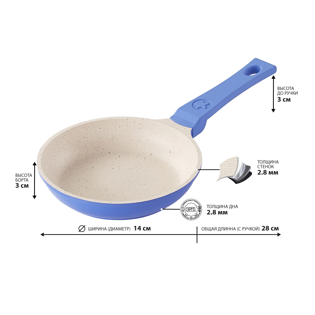 Сковорода мини GIPFEL LUVINIA 0691. Диаметр 14 см. Материал: литой алюминий. Толщина дна 2,8 мм, толщина стенок 1,5 мм. Антипригарное мраморное покрытие. Ручка из бакелита с мягким покрытием.