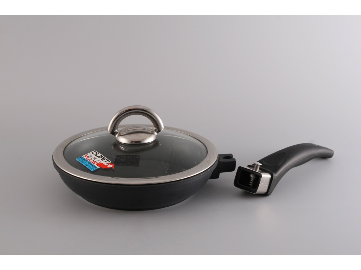 Отличный пример классической качественной сковороды – у нее есть все для того, чтобы сделать вашу готовку максимально удобной и комфортной. Прозрачная крышка из жаропрочного стекла, съемная бакелитовая ручка, индукционное дно и антипригарное покрытие Durit Protect Plus. Корпус сковороды изготовлен из литого алюминия, диаметр дна составляет 20 см.