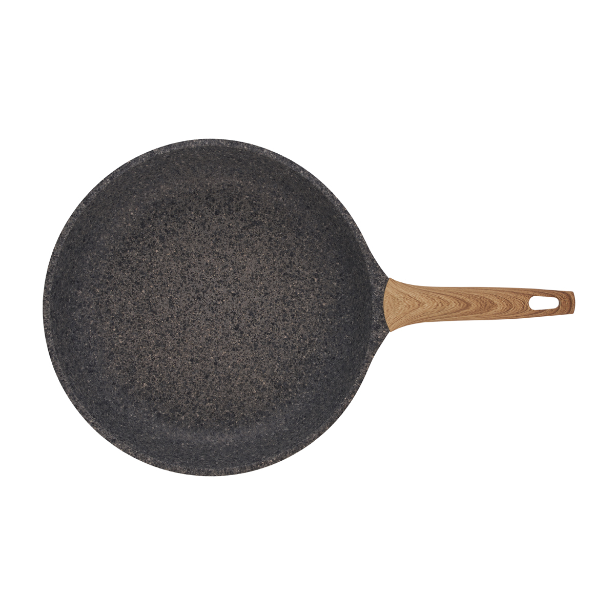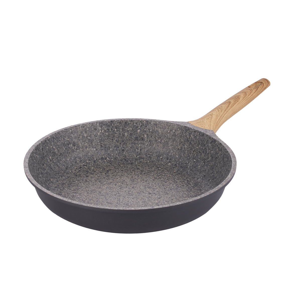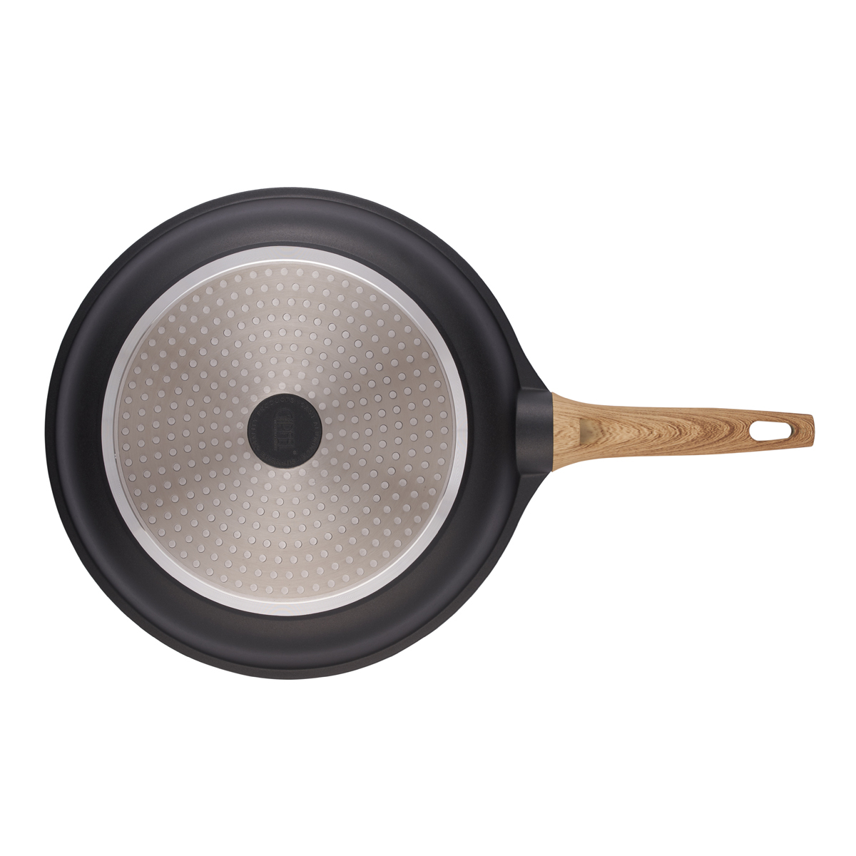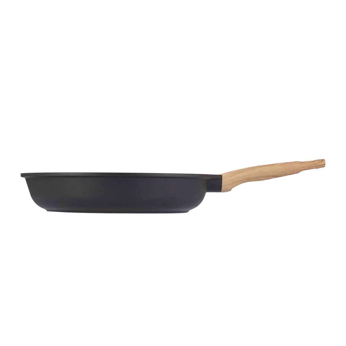 Данная сковорода изготовлена из литого алюминия – наиболее качественной технологии для данного металла, что гарантирует сковороде легкость, прочность, а также высокую стойкость к коррозии. Сковорода имеет довольно массивный корпус – толщина стенок составляет 2 мм, толщина дна – 4,7 мм. Гранитное антипригарное покрытие Pfluon Granite является одним из самых надежных, но при этом требует значительное количество масла при жарке. Добавляет удобства бакелитовая ручка с покрытием Soft-touch, которая не нагревается при готовке. Диаметр посуды составляет 32 см.