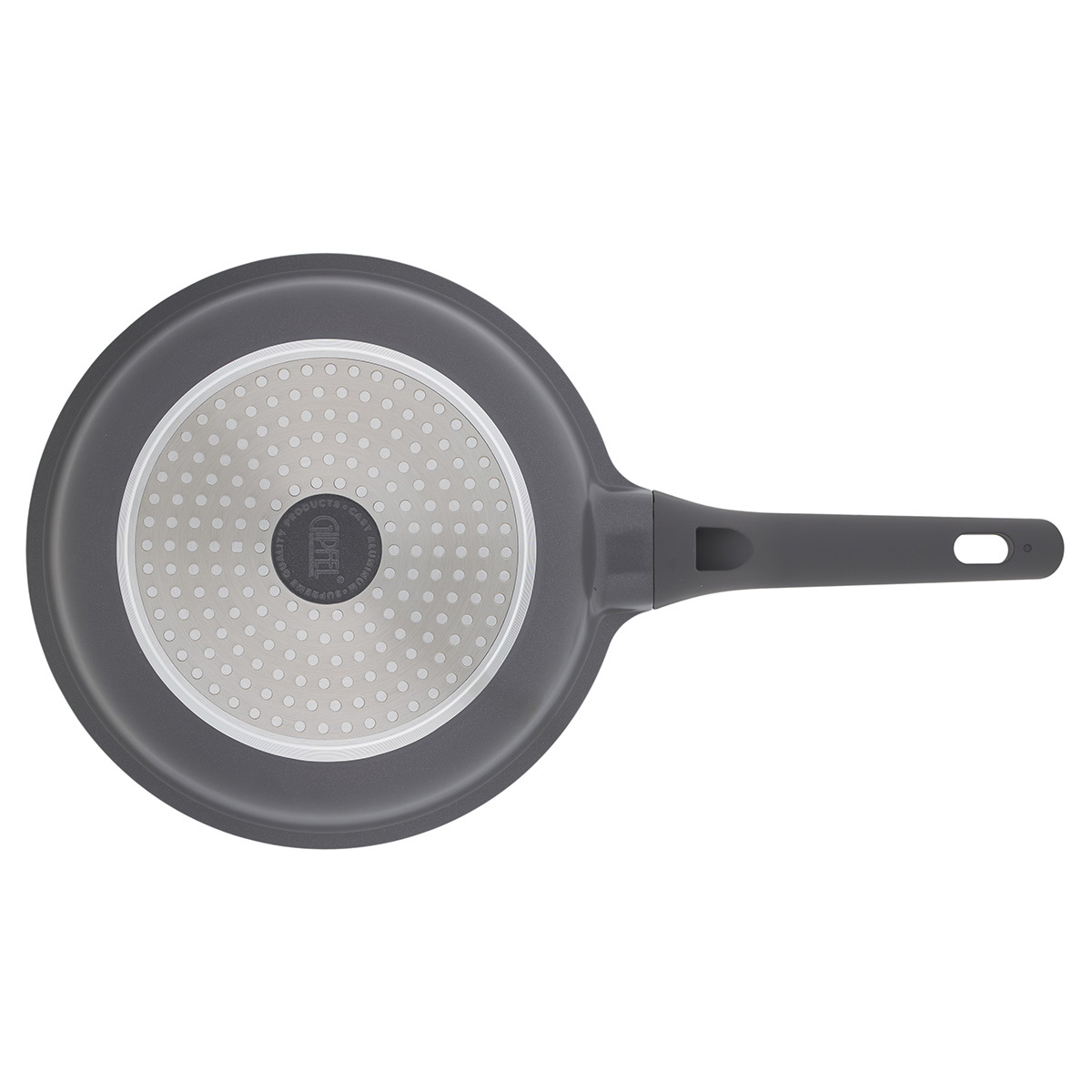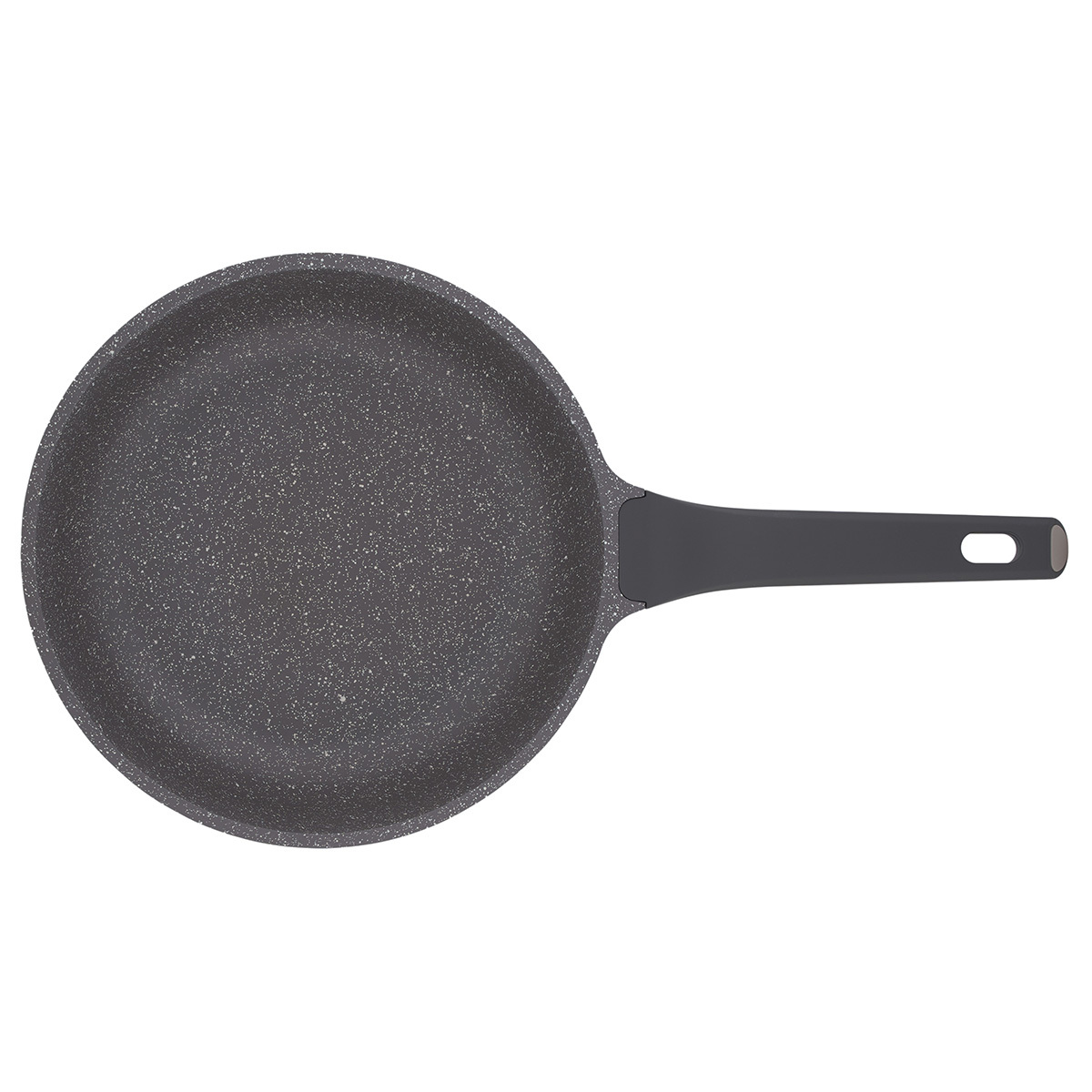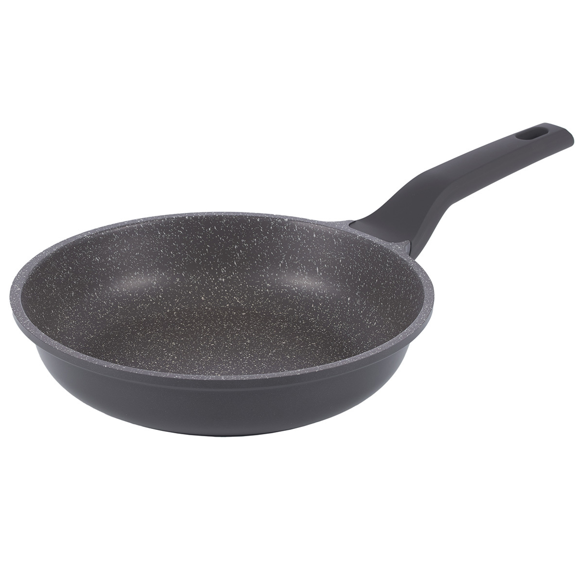 Сковорода выполнена в оригинальном дизайне в серо-коричневых оттенках цвета тауп, внутри с белыми вкраплениями.