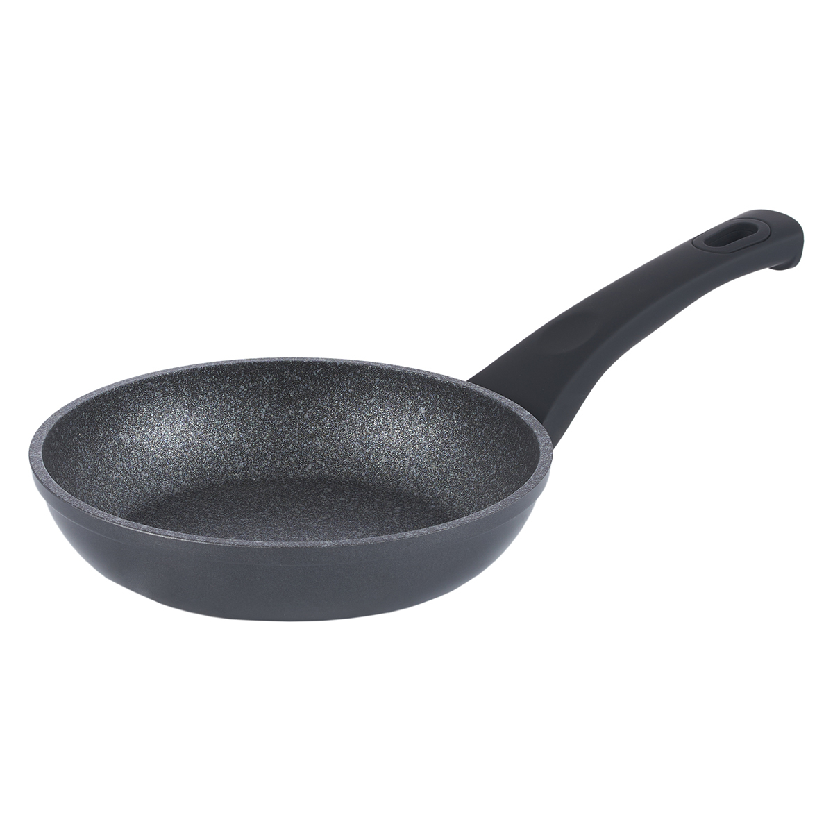Бакелитовая ручка с покрытием Soft Touch не скользит в руке и не нагревается при использовании сковороды на плите. Имеется отверстие для подвешивания.