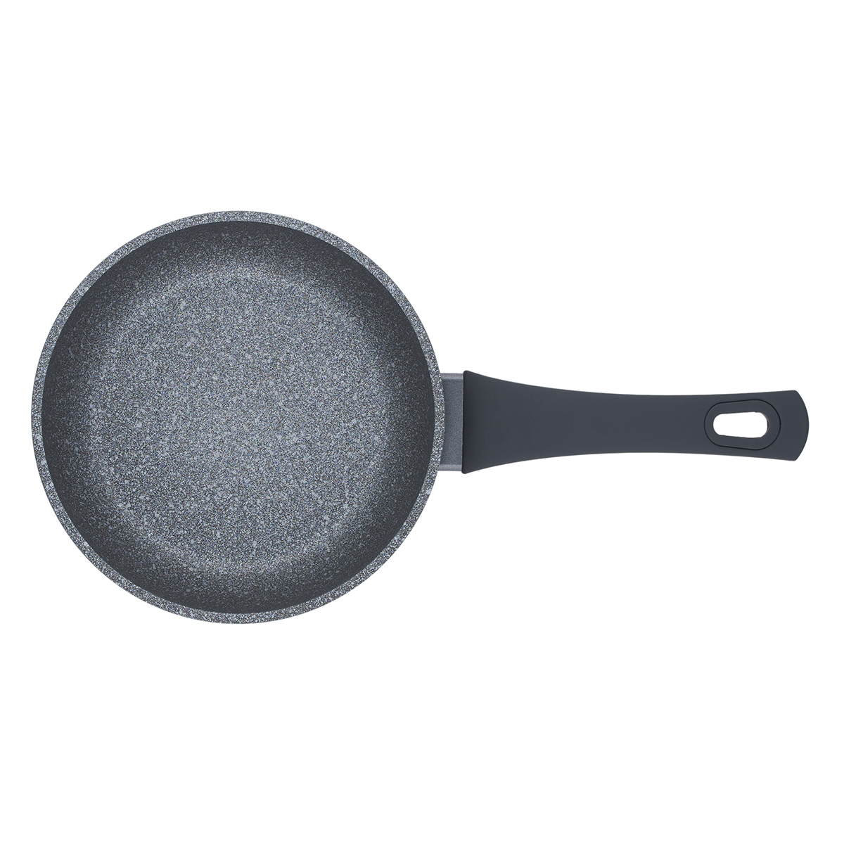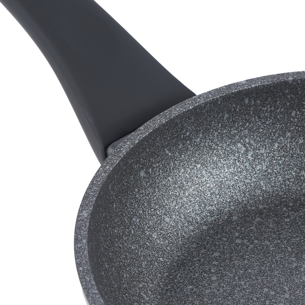 Корпус сковороды серого цвета с вкраплениями под мрамор, текстура дна шероховатая, ручка черного цвета, гладкая.