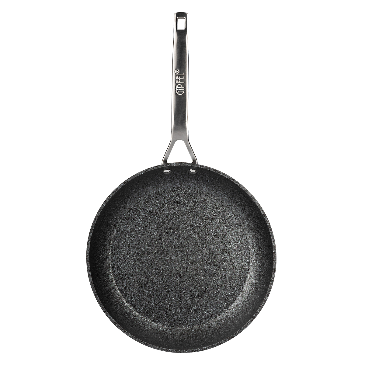 Сковорода выполнена в цвете мокрого асфальта, ручка цвета металла с логотипом Gipfel.