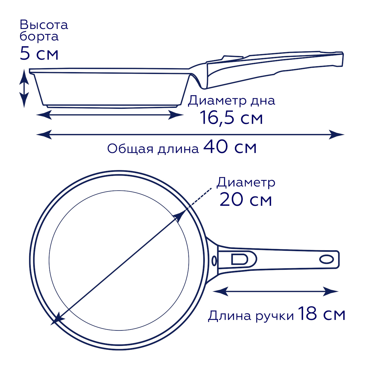 Сковорода размером 20x5 см изготовлена из литого алюминия, что позволяет ей равномерно нагреваться и распределять тепло. Толщина стенок 2 мм, толщина дна 4,7 мм.