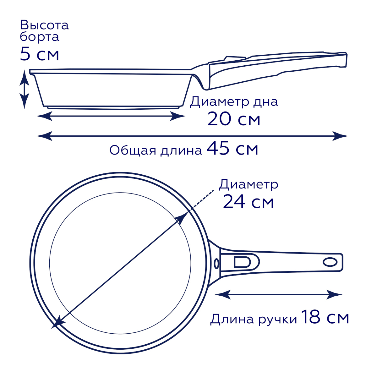 Сковорода размером 24x5 см изготовлена из литого алюминия, что позволяет ей равномерно нагреваться и распределять тепло. Толщина стенок 2 мм, толщина дна 4,7 мм.