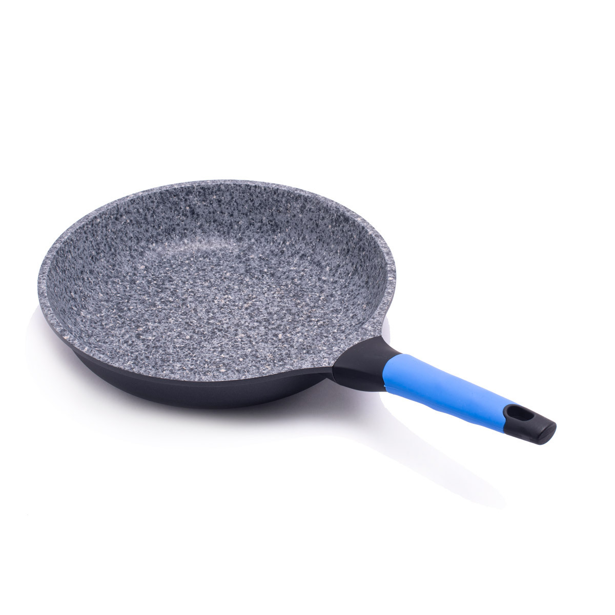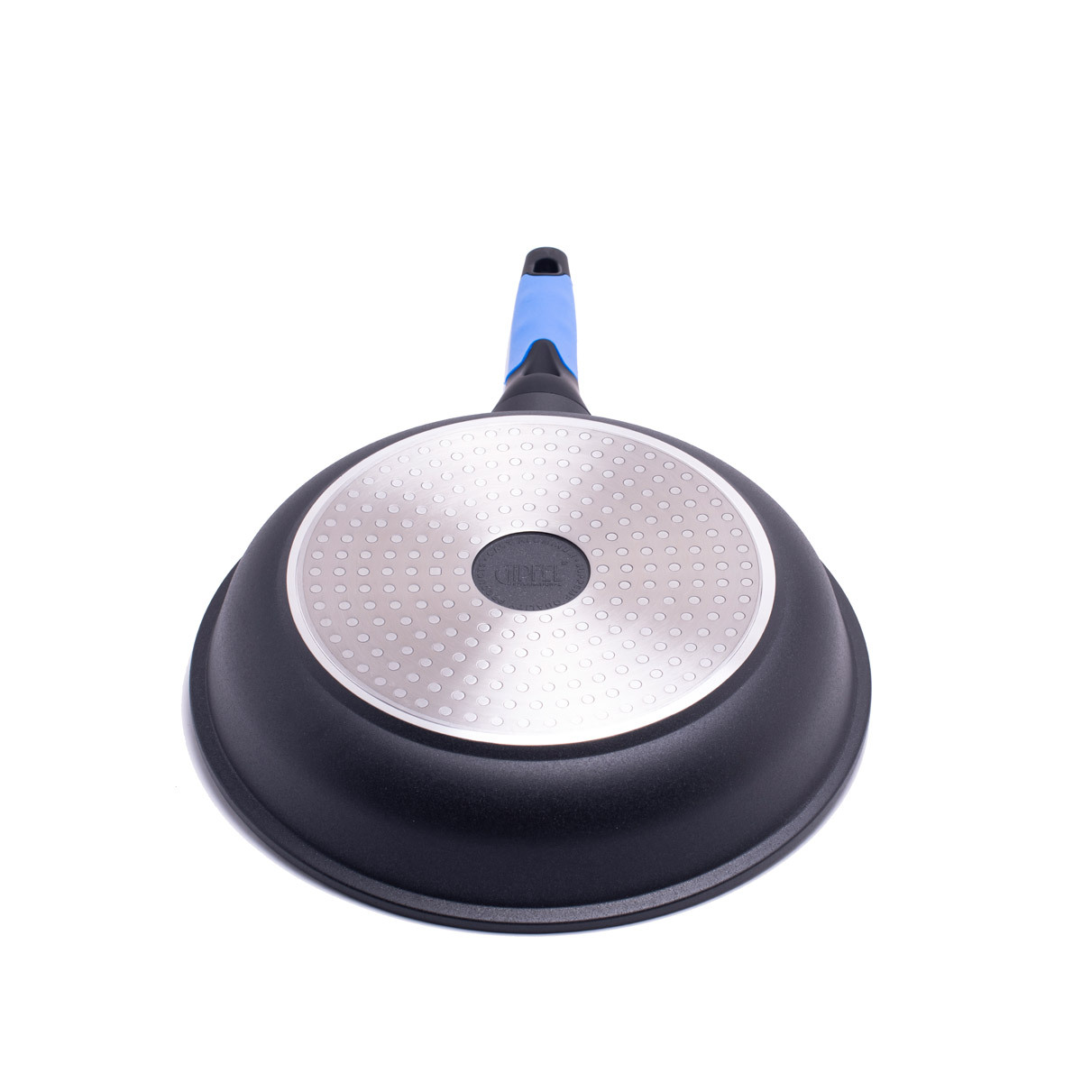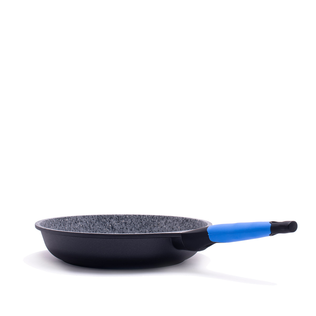 Вся посуда из серии SANDRA изготовлена из литого алюминия. Технология литья позволяет избежать механического воздействия на алюминий, что гарантирует более долгий срок службы посуды. Внутренняя часть корпуса сковороды покрыта антипригарным покрытием PFLUON, а внешняя – покрытием PTFE. На голубую бакелитовую ручку нанесено покрытие SOFT TOUCH. Диаметр данной сковороды составляет 28 см.