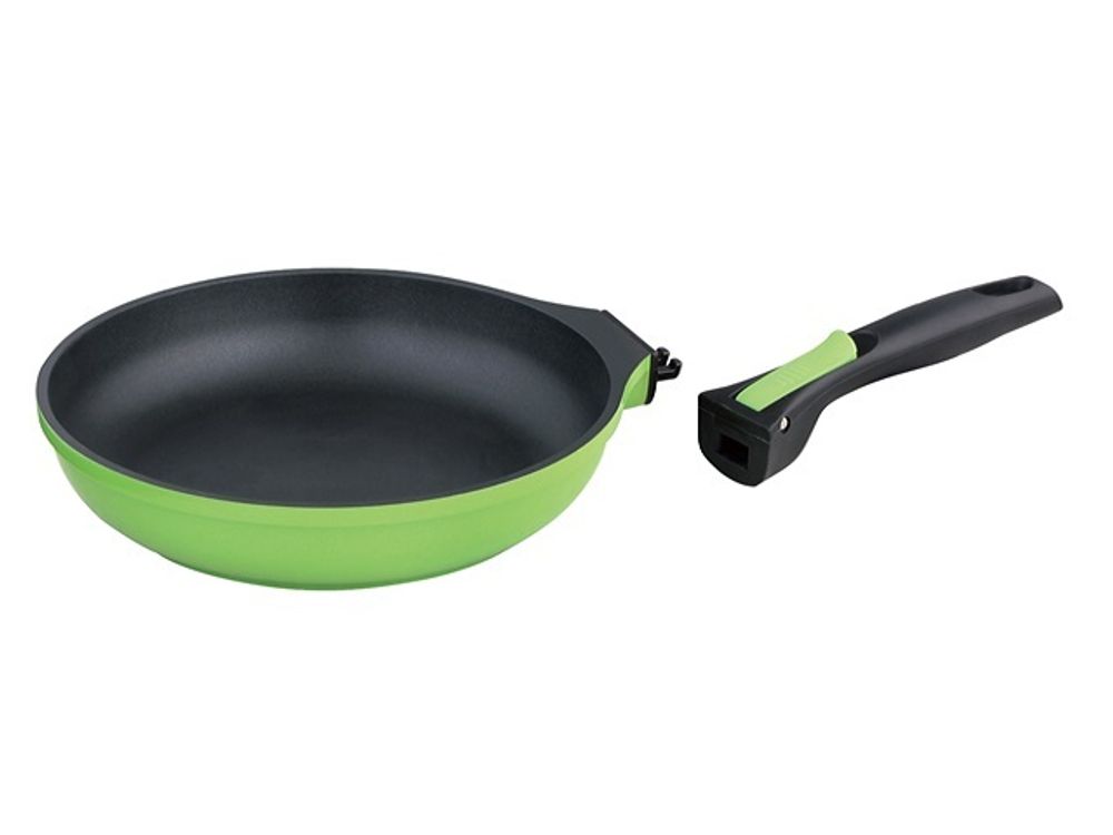 Сковорода SHAFRAN 28х5,5 см со съемной ручкой, индукционное дно. Цвет: внутри черный, снаружи зеленый.