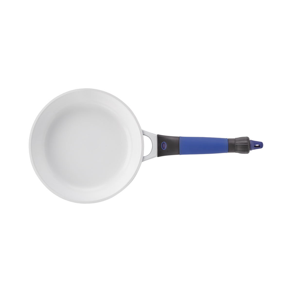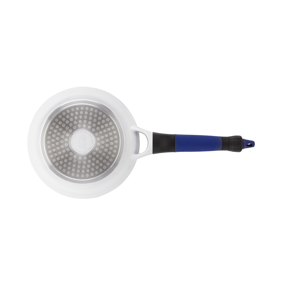 Сковорода GIPFEL SMART 1559 не может не удивить своим оригинальным дизайном – съемная ручка выполнена в форме Эйфелевой башни в черно-синей расцветке, которая оригинально контрастирует с основным белым цветом посуды. Корпус выполнен из алюминиевая, а ручка – из бакелита.