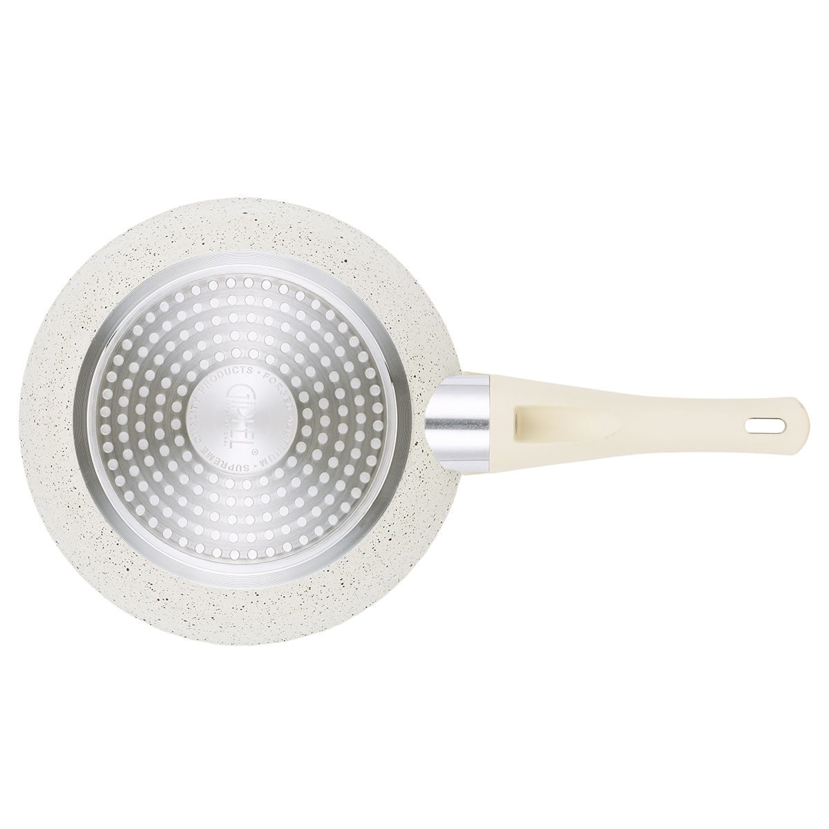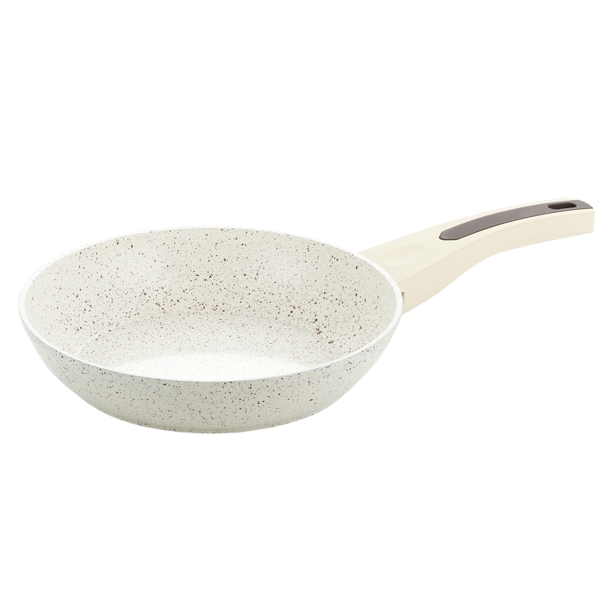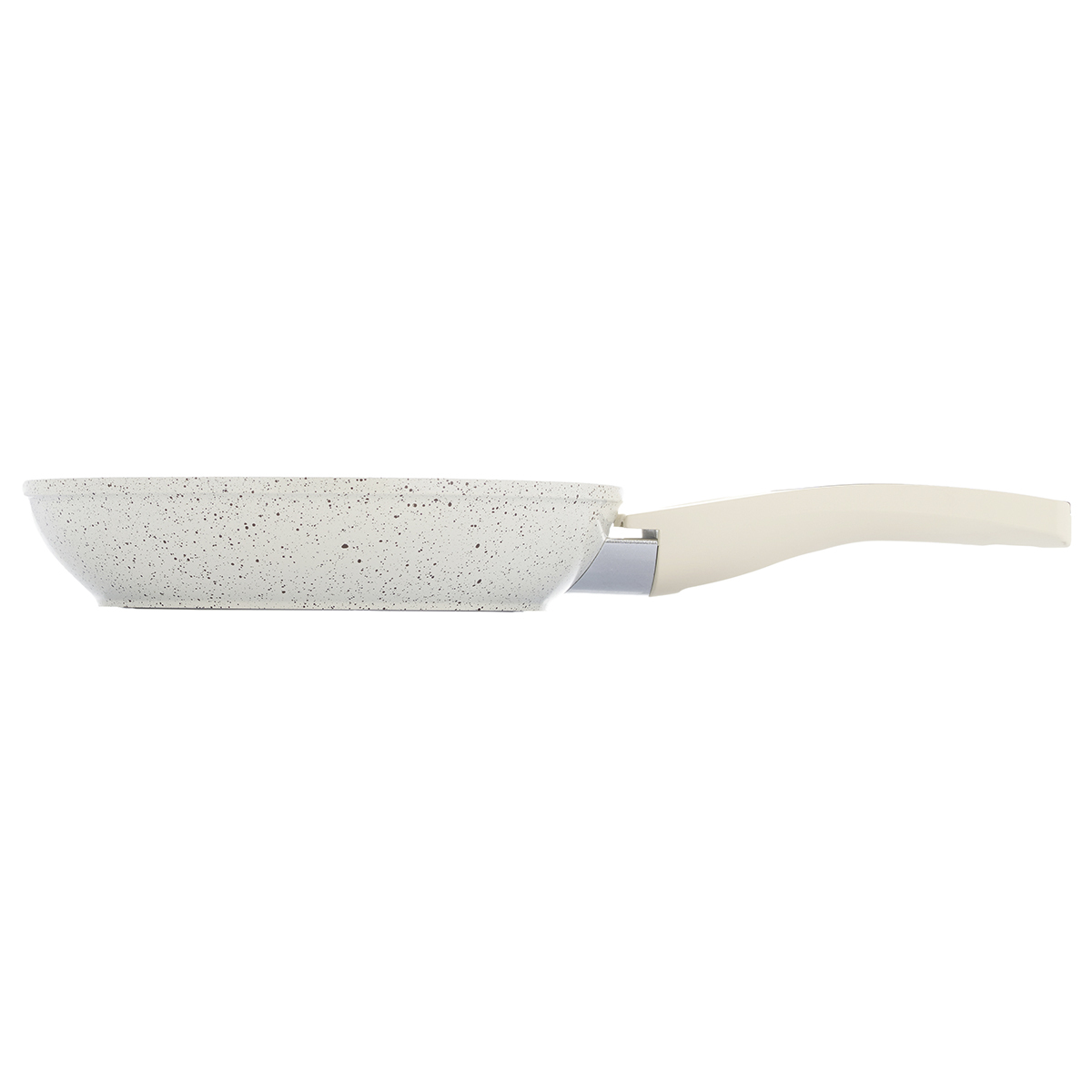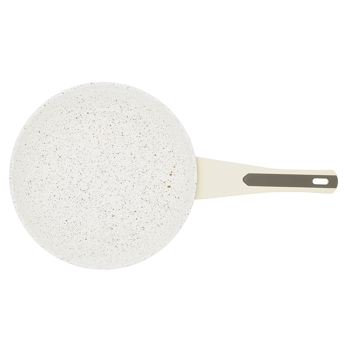 Сковорода выполнена в деликатном дизайне, имеет нежную бежевую расцветку и декорирована под мрамор. Наружный декор, имитирующий мраморные вкрапления, повторяет свой рисунок и на керамическом антипригарном покрытии внутри посуды, поддерживая гармоничное целостное восприятие. При этом керамическое покрытие не приобретает свойства мраморного.