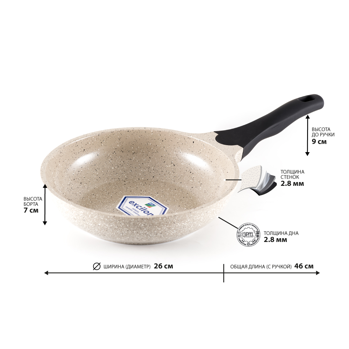 Сковорода Gipfel 2487 изготовлена из литого алюминия высокого качества, диаметр – 24 см, высота стенок – 5,5 см. Мраморное керамическое антипригарное покрытие EXCILON дает возможность не только готовить различные блюда с минимальным количеством масла, позволяя таким образом сохранить естественный вкус и аромат продуктов, но и значительно упрощает уход за сковородой. Подходит для индукционных плит. Изделие дополнено бакелитовой ручкой с силиконовым покрытием и упаковано в фирменную коробку.
