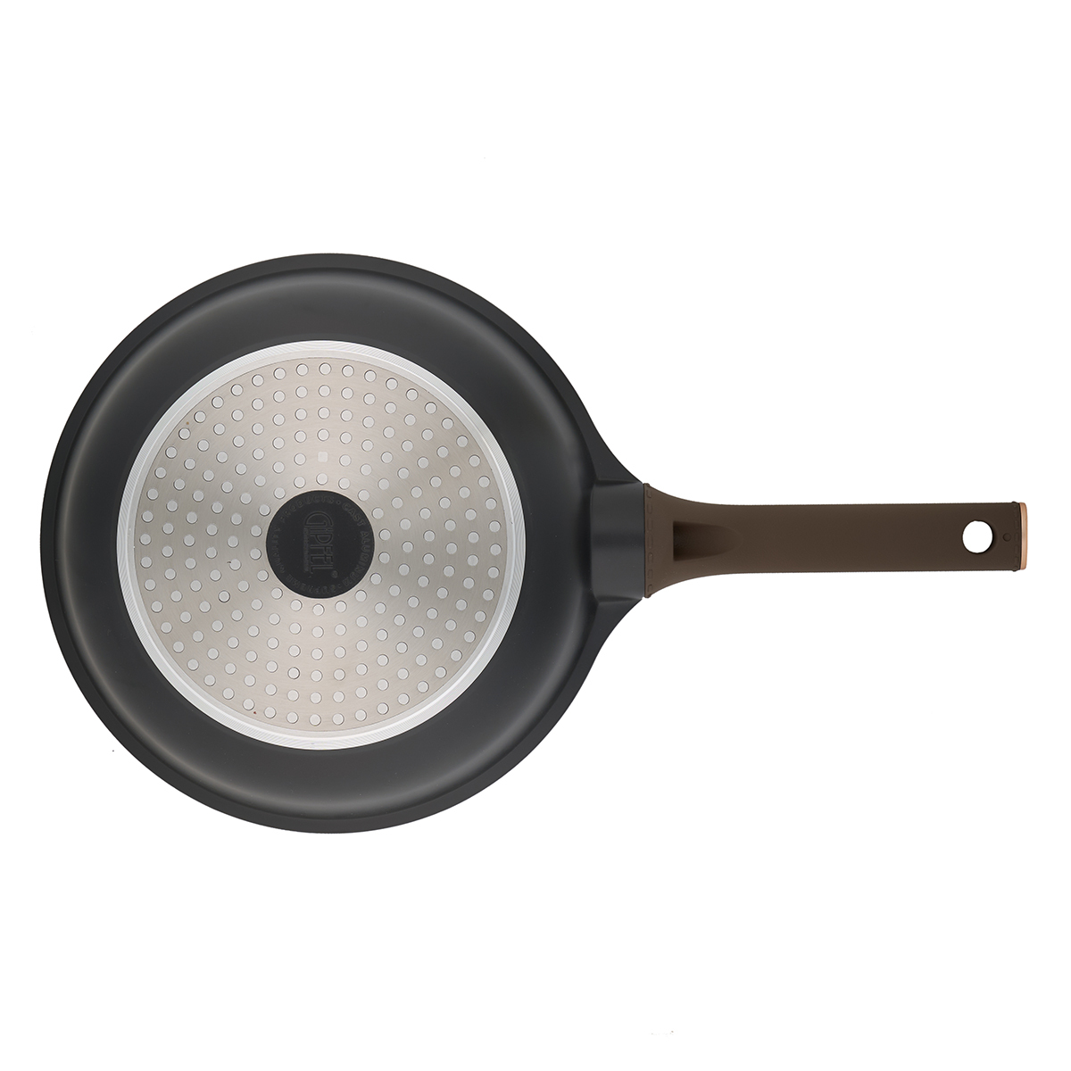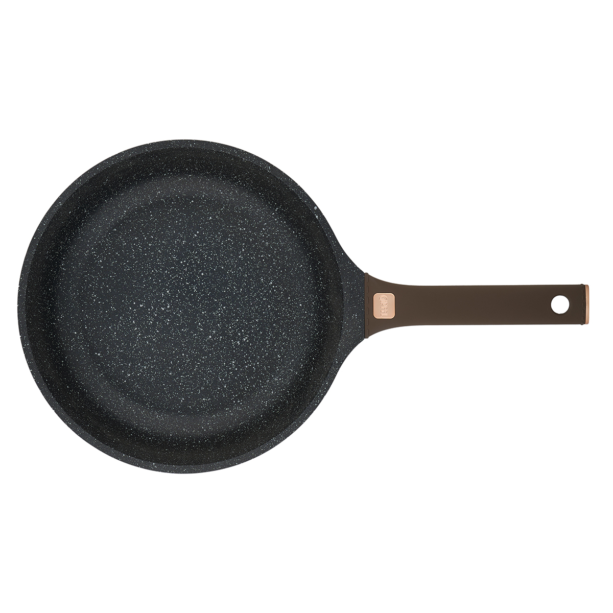 Сковорода выполнена в оригинальном дизайне в черно-коричневом цвете, внутри с белыми вкраплениями.